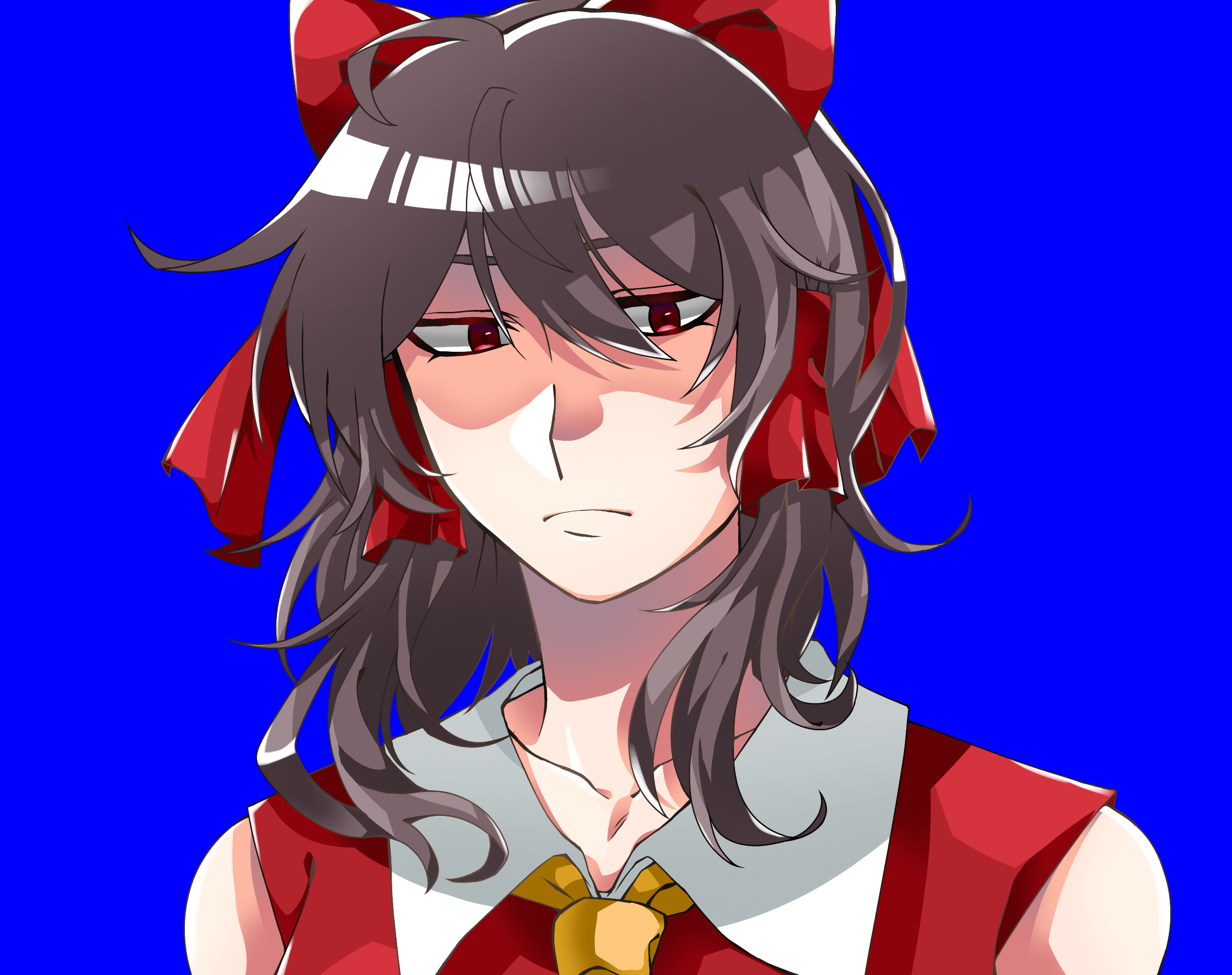 1girl ascot blue_background bow brown_hair closed_mouth collared_shirt commentary_request cookie_(touhou) expressionless hair_between_eyes hair_bow hair_tubes hakurei_reimu highres looking_at_viewer medium_hair portrait red_bow red_eyes red_shirt reu_(cookie) shaded_face shirt sidelocks simple_background sleeveless sleeveless_shirt solo touhou yellow_ascot zerachin_(nicoseiga78314664)