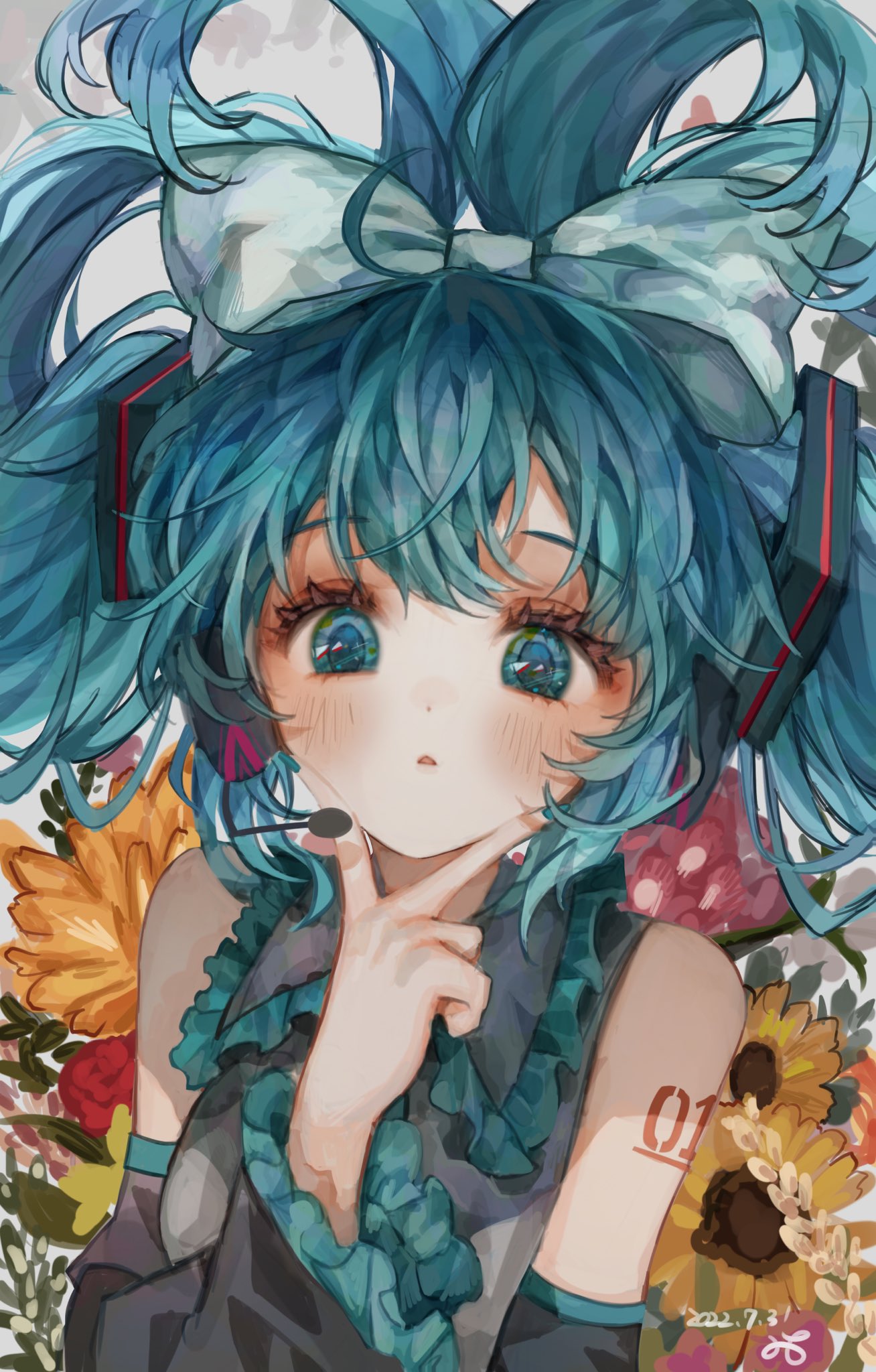 1girl aqua_bow aqua_eyes aqua_hair aqua_nails bad_id bad_twitter_id bare_shoulders black_sleeves blush body_writing bow cinnamiku collared_shirt commentary dated detached_sleeves floral_background flower frilled_shirt_collar frilled_sleeves frills grey_shirt hair_bow hair_ornament hand_on_own_chin hatsune_miku headset heart highres looking_at_viewer nail_polish ofgwr open_mouth sanrio shirt signature solo sunflower updo upper_body v vocaloid