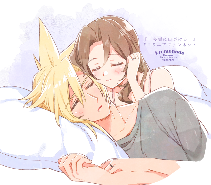 1boy 1girl 2021 aerith_gainsborough bad_id bad_pixiv_id bed_sheet blonde_hair blush brown_hair closed_eyes closed_mouth cloud_strife collarbone couple dated drooling final_fantasy final_fantasy_vii grey_shirt hair_between_eyes hetero jewelry krudears long_hair lying on_side open_mouth pillow ring shirt sketch sleeping spaghetti_strap spiked_hair title twitter_username watermark wedding_ring