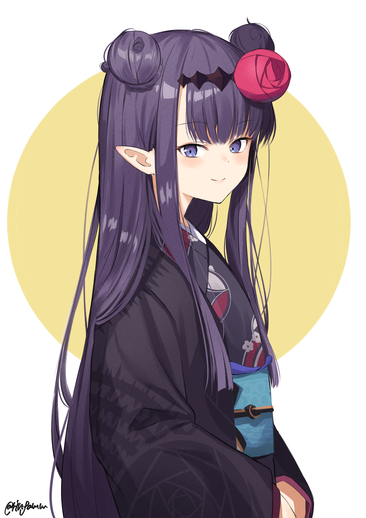 1girl black_kimono blush braid braided_bun bun_with_braided_base closed_mouth double_bun flower hair_bun hair_flower hair_ornament haori highres hololive hololive_english japanese_clothes kimono long_hair long_sleeves looking_at_viewer ninomae_ina'nis ninomae_ina'nis_(new_year) obi pointy_ears purple_eyes purple_hair rinfamm sash simple_background smile solo twitter_username upper_body virtual_youtuber