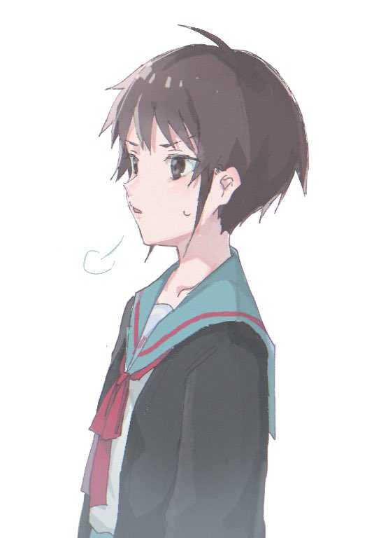 1girl alternate_hair_length alternate_hairstyle black_cardigan cardigan collarbone commentary_request enso_doraiba from_side genderswap genderswap_(mtf) kita_high_school_uniform kyonko long_sleeves open_cardigan open_clothes red_ribbon ribbon sailor_collar school_uniform serafuku short_hair solo suzumiya_haruhi_no_yuuutsu upper_body