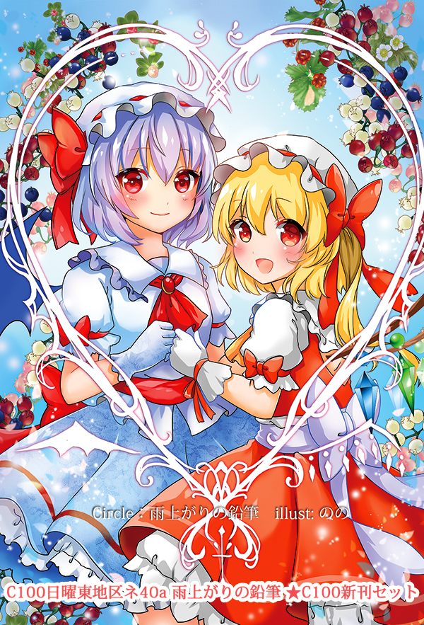 2girls ascot back_bow bat_wings blonde_hair blue_background blue_gloves blue_skirt bow breasts brooch closed_mouth collared_shirt comiket_100 cowboy_shot flandre_scarlet frilled_shirt_collar frilled_skirt frilled_sleeves frills gloves hair_between_eyes hair_bow hat hat_ribbon heart jewelry lakestep55 looking_at_viewer medium_hair mob_cap multicolored_wings multiple_girls open_mouth orange_ascot promotional_art puffy_short_sleeves puffy_sleeves purple_hair red_ascot red_bow red_eyes red_ribbon red_skirt red_vest remilia_scarlet ribbon shirt short_hair short_sleeves skirt skirt_set small_breasts smile touhou vest white_bow white_gloves white_headwear white_shirt wings