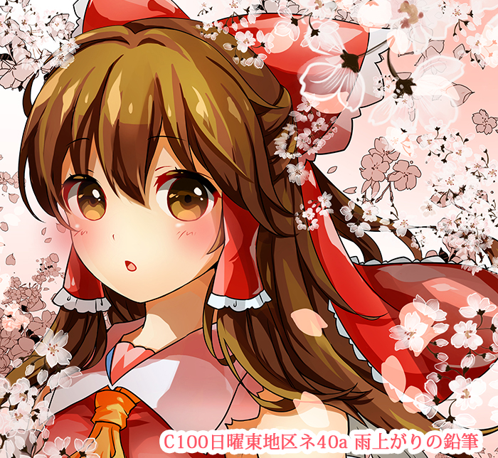 1girl ascot bare_shoulders bow brown_eyes brown_hair close-up comiket_100 commentary_request floral_background frilled_bow frilled_hair_tubes frills hair_between_eyes hair_bow hair_tubes hakurei_reimu lakestep55 long_hair orange_ascot pink_background promotional_art red_bow shirt sleeveless sleeveless_shirt solo touhou