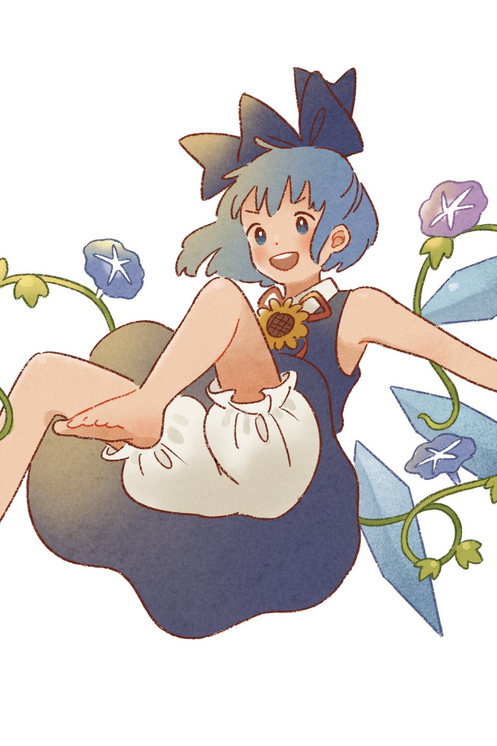 1girl :d bloomers blue_bow blue_dress blue_eyes blue_hair bow cirno dot_nose dress flower hair_bow highres morning_glory open_mouth outstretched_arms plant short_hair sleeveless sleeveless_dress smile spread_arms teeth toe_miyama touhou underwear upper_teeth_only v-shaped_eyebrows vines