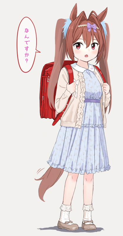 1girl aged_down animal_ears backpack bag blue_dress blush bobby_socks breasts brown_hair collared_shirt daiwa_scarlet_(umamusume) dress fang full_body hair_intakes horse_ears horse_girl horse_tail mary_janes open_mouth randoseru red_eyes shibasaki_shouji shirt shoes skin_fang small_breasts socks solo speech_bubble standing tail translation_request twintails umamusume yellow_shirt