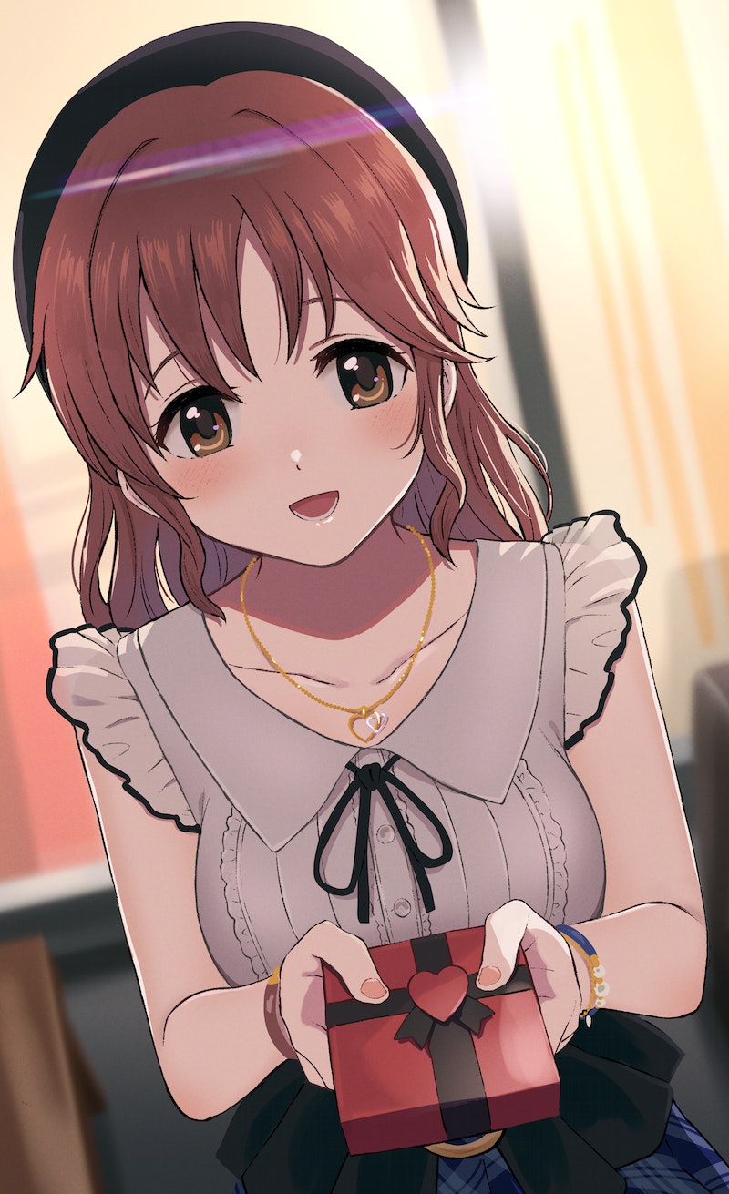 1girl beret black_hat blue_skirt blush bracelet breasts brown_hair collarbone collared_shirt commission gift hat highres holding holding_gift idolmaster idolmaster_cinderella_girls jewelry long_hair looking_at_viewer medium_breasts necklace open_mouth reaching reaching_towards_viewer shibasaki_shouji shirt skeb_commission skirt sleeveless sleeveless_shirt smile solo totoki_airi upper_body white_shirt
