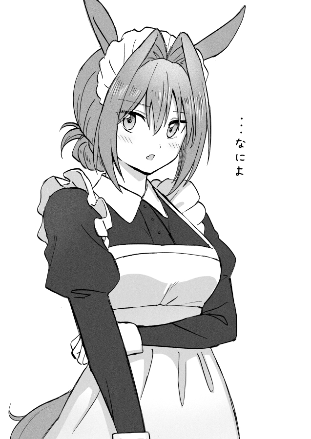 1girl alternate_costume alternate_hair_length alternate_hairstyle animal_ears apron arm_under_breasts blush breasts collared_dress daiwa_scarlet_(umamusume) dress enmaided greyscale hair_bun hair_intakes horse_ears horse_girl horse_tail juliet_sleeves long_sleeves looking_at_viewer maid maid_apron maid_headdress medium_breasts monochrome open_mouth puffy_sleeves shibasaki_shouji short_sleeves solo tail translation_request umamusume