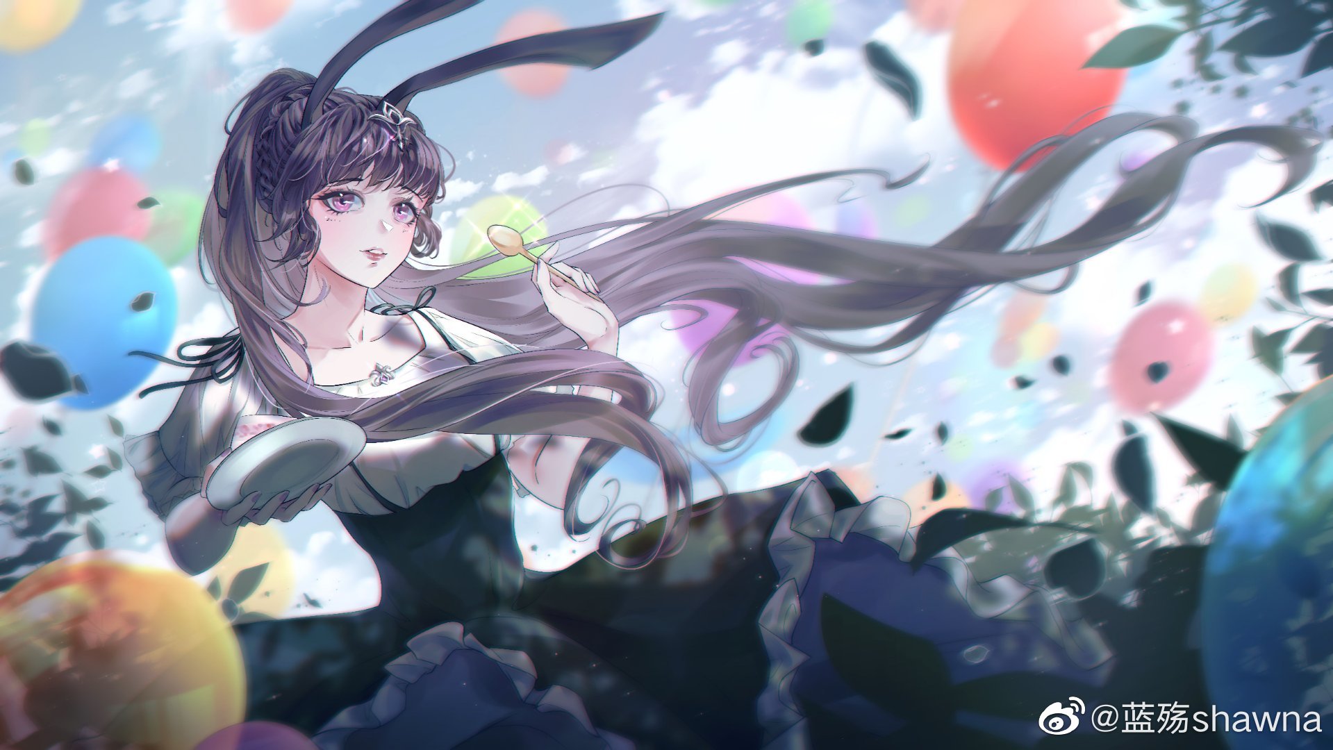 1girl animal_ears balloon black_hair black_skirt blue_sky cloud douluo_dalu falling_leaves from_below highres lan_shang_shawna leaf long_hair plate ponytail rabbit_ears shirt short_sleeves skirt sky solo spoon teeth upper_body white_shirt wind xiao_wu_(douluo_dalu)