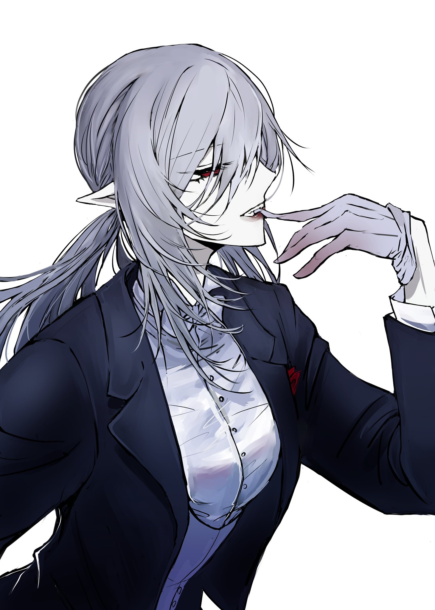 1girl alternate_costume arknights biting blue_jacket commentary formal_clothes gladiia_(arknights) biting_glove gloves grey_hair highres jacket jiru_(6pp_ab) long_hair open_clothes open_jacket pale_skin pointy_ears ponytail red_eyes shirt simple_background solo suit suit_jacket upper_body white_background white_shirt