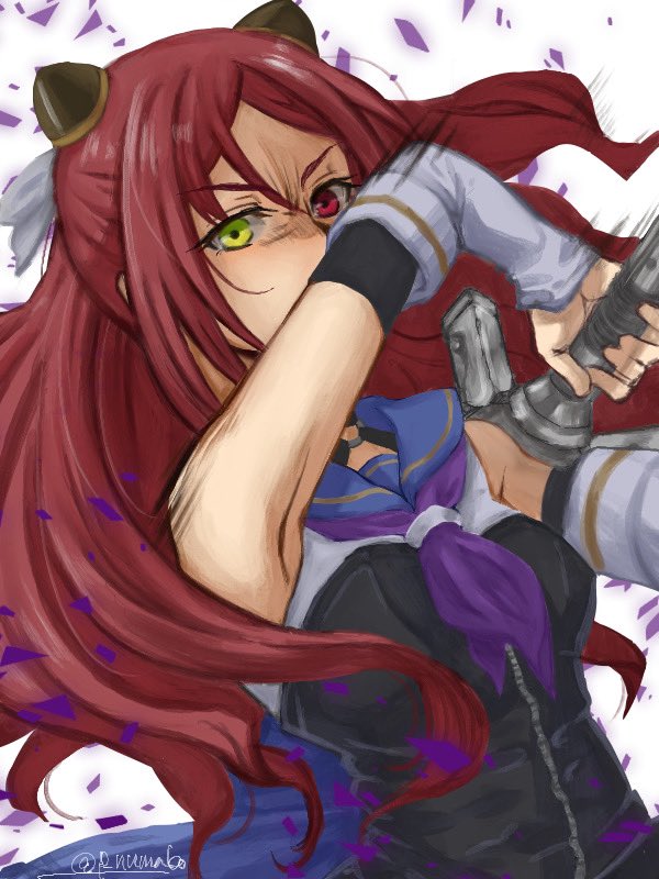 1girl angry assault_lily bare_shoulders black_shirt blue_sailor_collar breasts commentary_request covered_mouth detached_sleeves floating_hair furrowed_brow green_eyes hair_between_eyes hairpods half_updo hand_up heterochromia holding holding_weapon layered_sleeves long_hair long_sleeves looking_at_viewer medium_breasts motion_lines neckerchief numanuma parted_lips purple_neckerchief red_eyes red_hair sailor_collar school_uniform serafuku shaded_face shiba_tomoshibi shirt sidelocks solo speed_lines standing twitter_username two-tone_shirt weapon white_background white_shirt