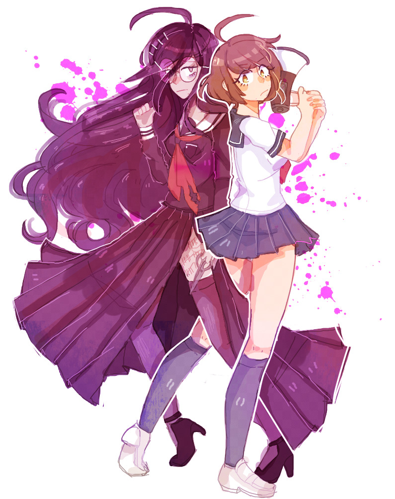 2girls ahoge black_footwear blood blood_splatter blue_skirt breasts brown_hair kneehighs closed_mouth collared_dress collared_shirt danganronpa_(series) danganronpa_another_episode:_ultra_despair_girls dress fukawa_toko full_body glasses green_eyes hair_between_eyes hair_ornament hairclip hands_up long_hair looking_at_viewer matching_hair/eyes medium_breasts medium_hair megaphone multiple_girls naegi_komaru palms pink_blood pleated_skirt purple_eyes purple_footwear purple_hair purple_socks purple_thighhighs round_eyewear scar scar_on_leg scissors shirt short_sleeves simple_background skirt small_breasts socks standing tally thighhighs white_background white_footwear white_shirt