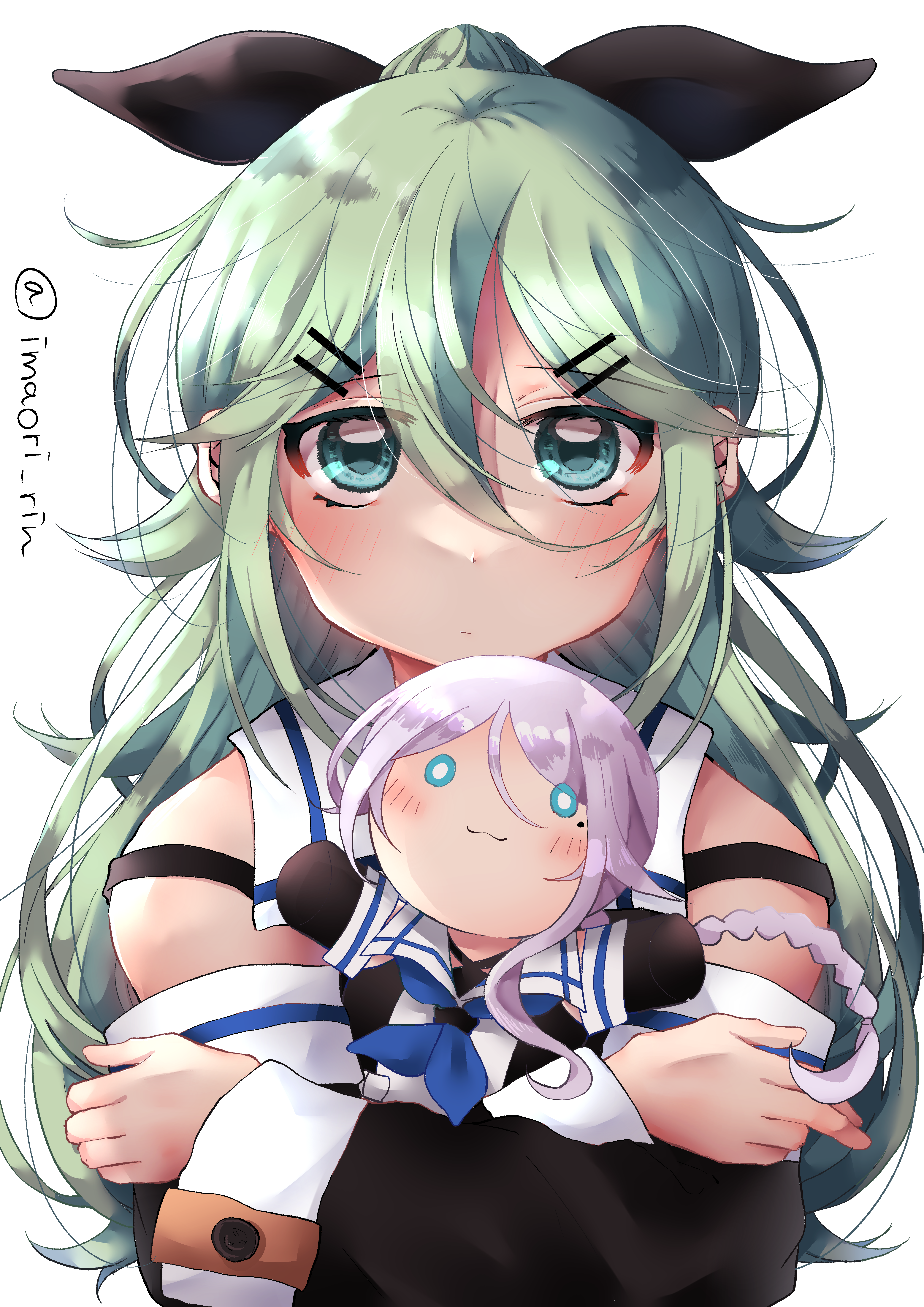 1girl absurdres black_ribbon black_serafuku blue_neckerchief character_doll detached_sleeves doll green_eyes green_hair hair_between_eyes hair_flaps hair_ornament hair_ribbon hairclip highres imaori_rin kantai_collection long_hair neckerchief parallel_hairclips parted_bangs ponytail ribbon school_uniform serafuku sidelocks solo umikaze_(kancolle) upper_body yamakaze_(kancolle)