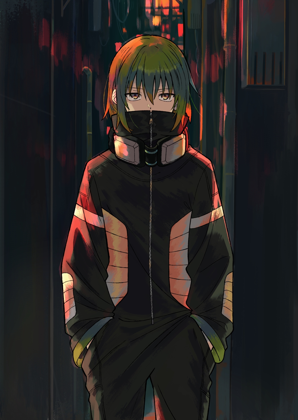 1boy black_jacket black_pants cail_(pokemon) commentary_request cowboy_shot green_hair hair_between_eyes hands_in_pockets high_collar highres ittumozzz jacket long_sleeves looking_at_viewer male_focus nintendo pants pokemon pokemon_colosseum short_hair solo zipper zipper_pull_tab