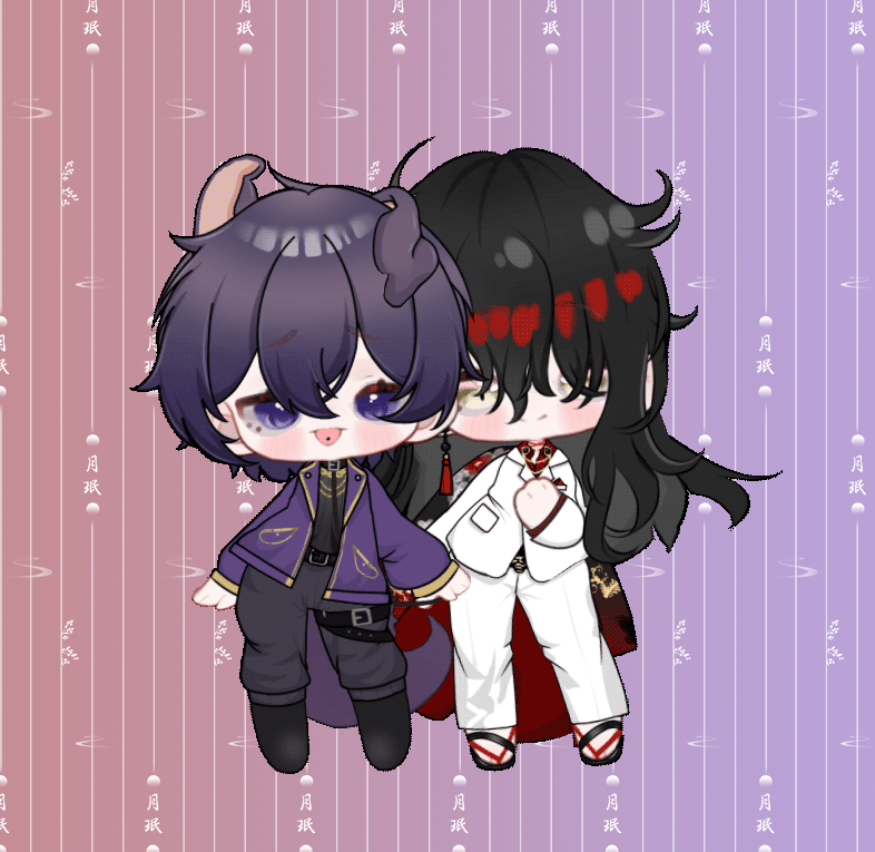 2boys animal_ears animated animated_gif antenna_hair bead_bracelet beads belt black_belt black_footwear black_hair black_nails black_pants bracelet breast_pocket capri_pants chain chibi dancing dog_boy dog_ears dress_shirt earrings eyeliner floral_print full_body gold_chain gold_necklace hair_ornament hairclip handkerchief hood hooded_jacket indie_virtual_youtuber jacket japanese_clothes jewelry kimono kimono_on_shoulders long_sleeves looking_at_viewer makeup male_focus multicolored_hair multiple_boys nail_polish necklace nijisanji nijisanji_en pants piercing pocket purple_eyes purple_hair purple_jacket red_eyeliner red_hair red_kimono red_shirt ribbed_sweater rope_around_feet sandals shirt shoes short_hair shoto_(vtuber) single_earring smile sneakers sweater tassel tassel_earrings tongue tongue_out tongue_piercing turtleneck turtleneck_sweater v-shaped_eyebrows virtual_youtuber vox_akuma white_jacket white_pants yellow_eyes yue_min
