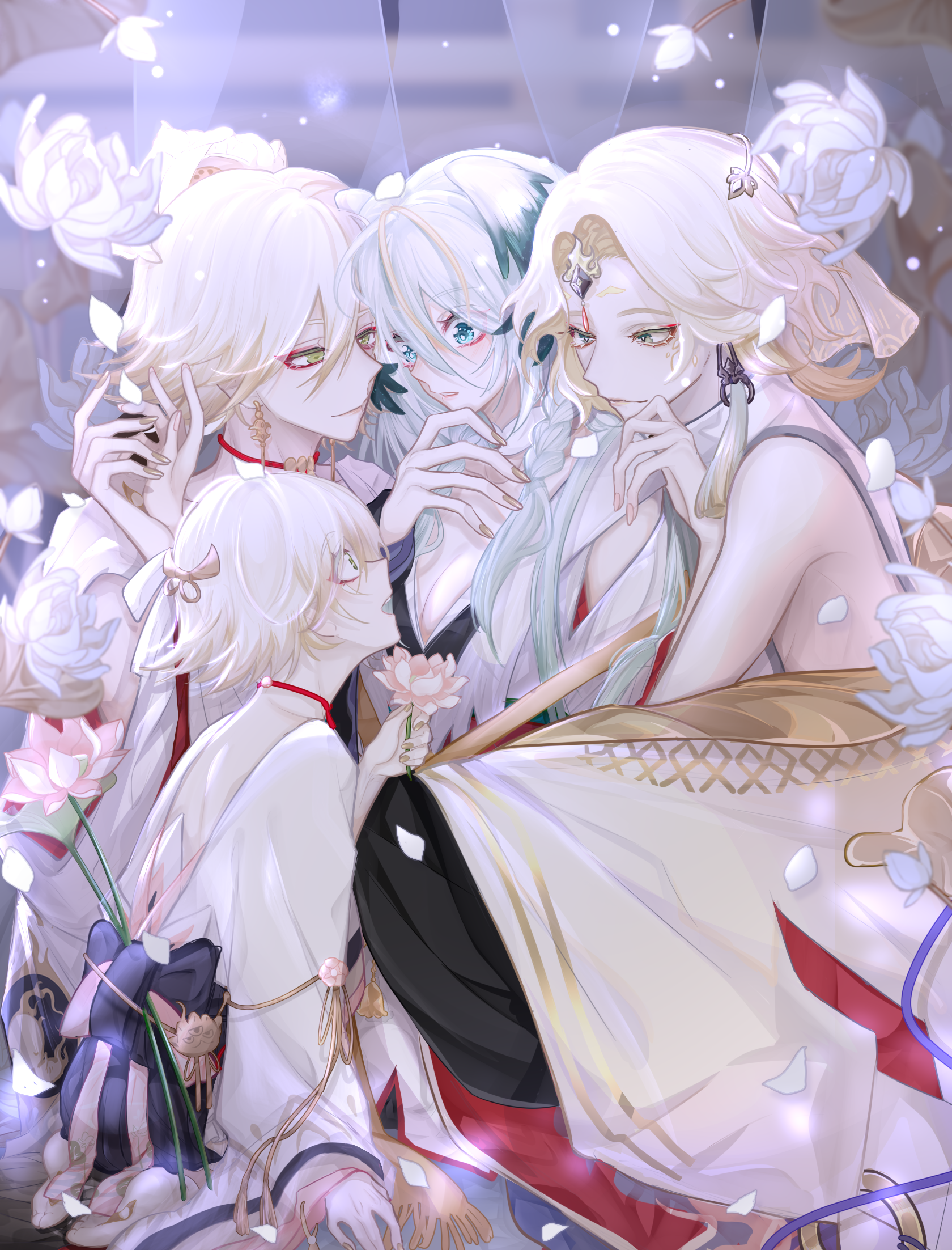 1boy 1girl bare_back bare_pectorals bare_shoulders bishounen blonde_hair blue_eyes breasts child cleavage curtains earrings eyeliner eyeshadow face-to-face falling_petals flower green_eyes highres holding holding_flower japanese_clothes jewelry kinnara_(onmyoji) light_smile long_hair lotus lotus_earrings lotus_hair_ornament makeup male_focus male_harem multiple_views nail_polish onmyoji parted_bangs pectorals petals pink_fur red_eyeshadow semi-transparent short_hair sidelocks silk sitting string_choker taishakuten_(onmyoji) tober very_long_hair white_lotus yellow_nails
