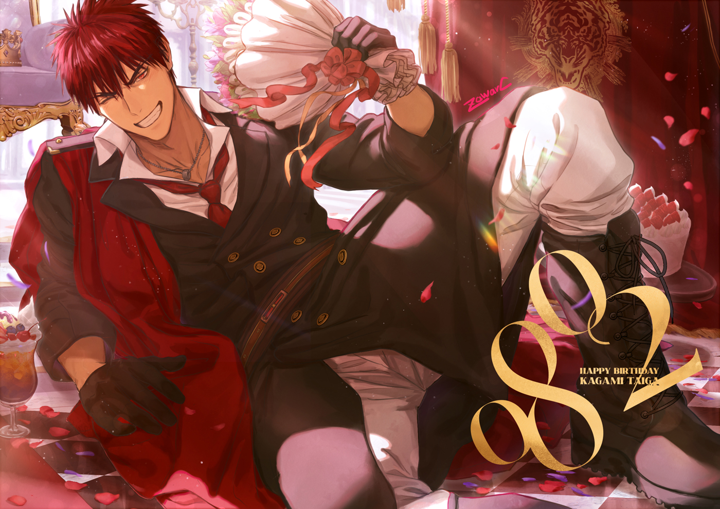 1boy artist_name birthday birthday_cake black_boots black_coat black_gloves boots bouquet buttons cake cape character_name checkered_floor chocolate chocolate_syrup coat commentary_request crown cup dated dress_shirt drink drinking_glass flower food fruit glass gloves grin happy happy_birthday holding holding_bouquet indoors jewelry kagami_taiga kuroko_no_basuke long_sleeves looking_at_viewer male_focus necklace necktie on_floor on_one_knee one_eye_closed pants petals pink_flower red_cape red_eyes red_hair red_necktie ring shirt short_hair smile solo strawberry throne whipped_cream white_pants white_shirt zawar379
