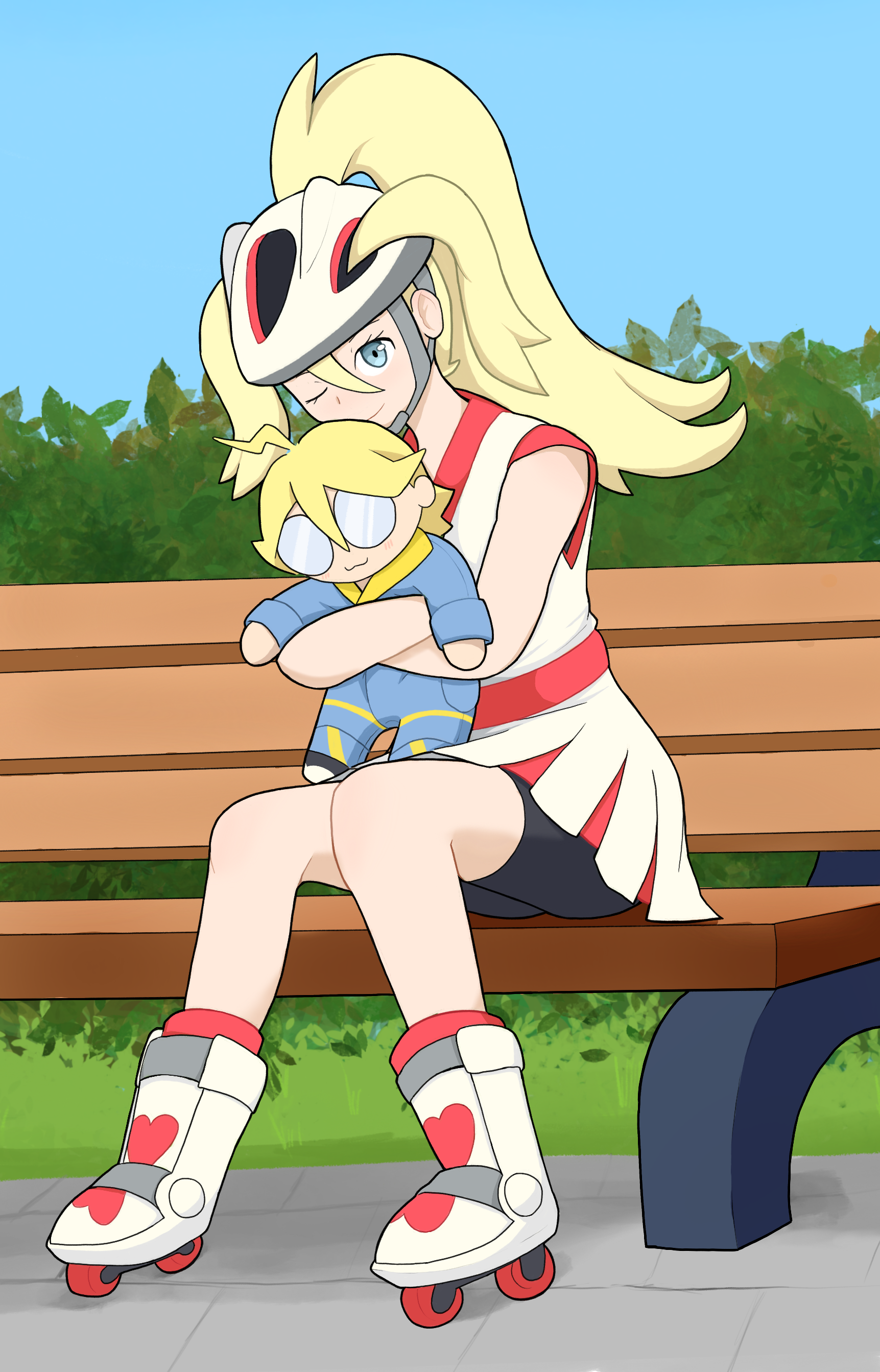 1girl :3 absurdres bench bike_shorts blonde_hair blue_eyes blush bush character_doll clemont_(pokemon) doll drawfag dress glasses grass gym_leader helmet highres holding holding_doll hugging_doll hugging_object korrina_(pokemon) looking_at_viewer nintendo one_eye_closed pokemon pokemon_x_and_y ponytail roller_skates sitting skates sky sleeveless sleeveless_dress smile