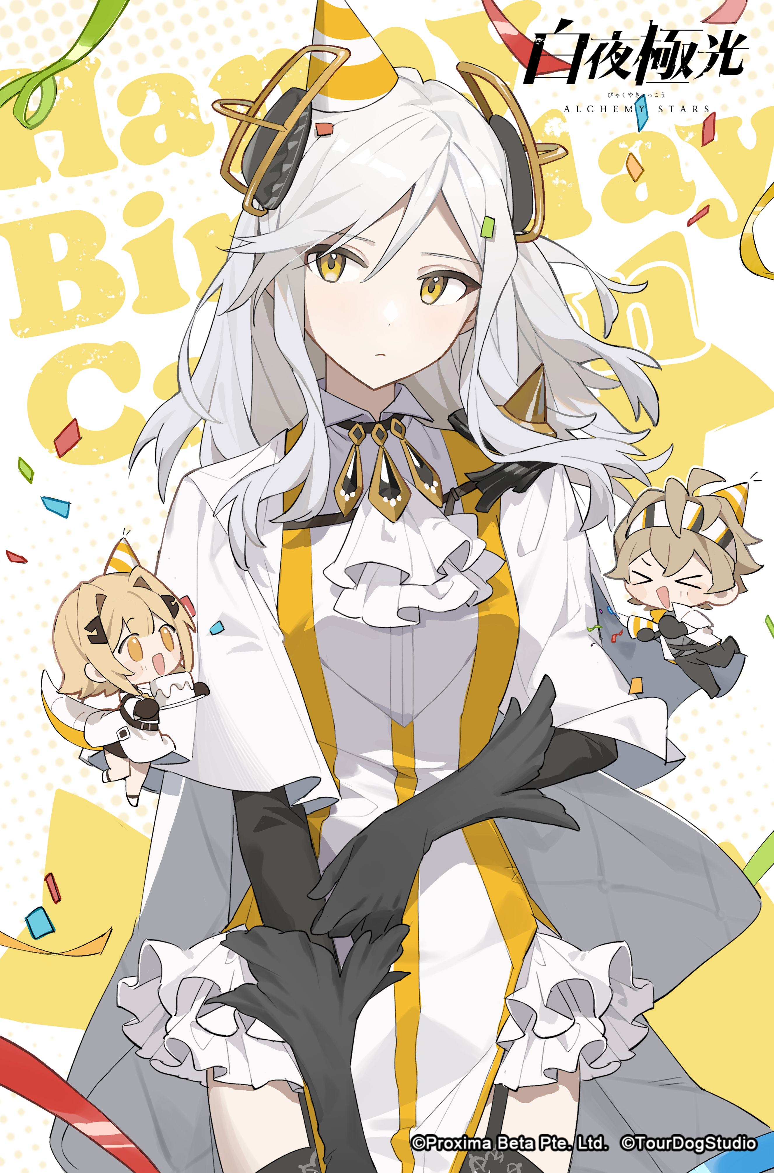 >_< 1boy 2girls absurdres alchemy_stars ascot black_gloves black_thighhighs cake cape carleen_(alchemy_stars) chibi closed_mouth company_name confetti copyright_name copyright_notice cowboy_shot dress food garter_straps gloves hair_ornament hat highres long_hair long_sleeves looking_to_the_side multicolored_hair multiple_girls navigator_(alchemy_stars) official_art party_hat party_popper pelvic_curtain side_slit solo_focus streaked_hair thighhighs vice_(alchemy_stars) white_cape white_hair yellow_eyes