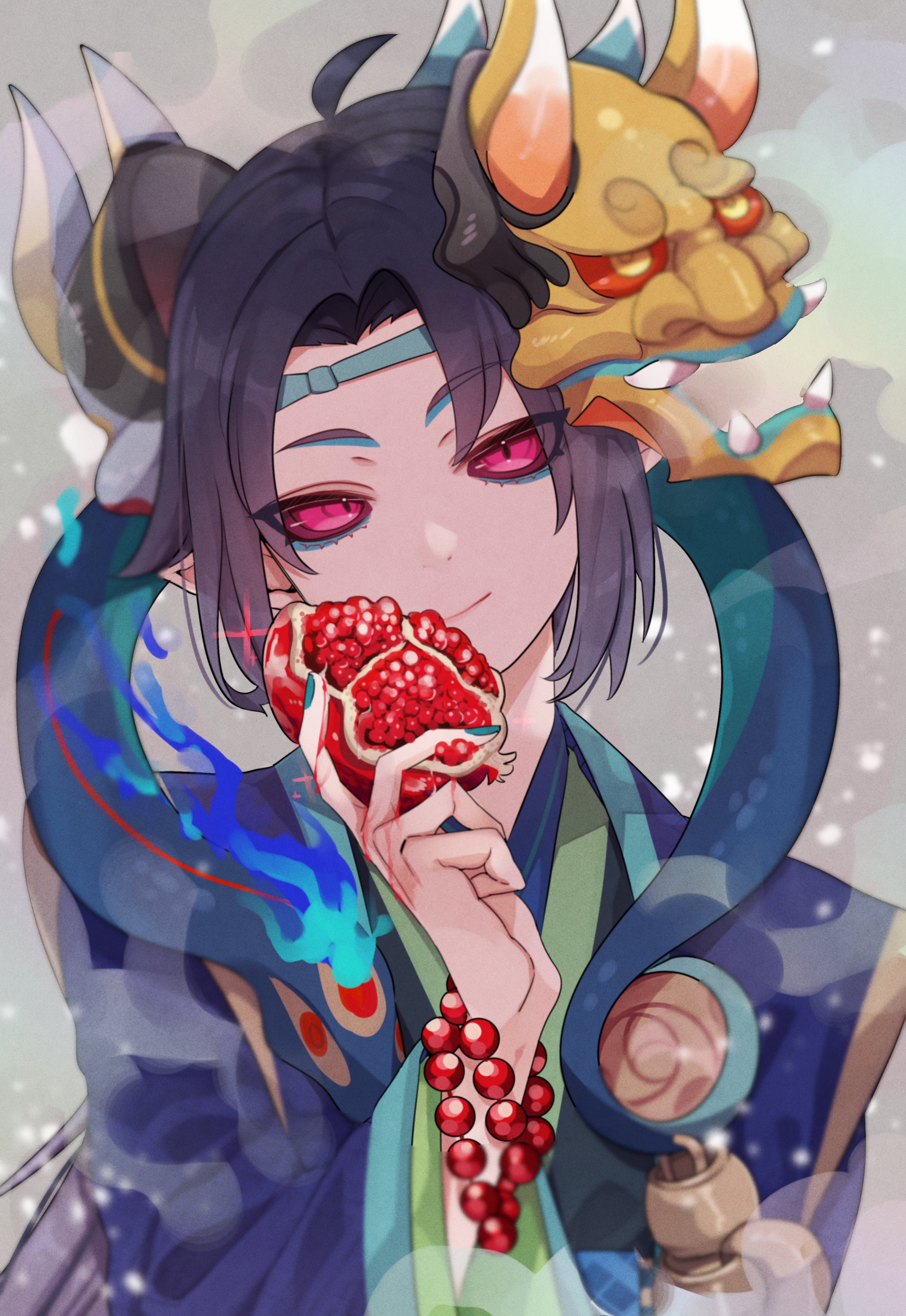 absurdres aqua_nails bracelet chain colored_sclera evil_smile fire food fruit green_nails hannya_(onmyoji) head_tilt highres holding holding_food holding_fruit japanese_clothes jewelry light_smile long_hair looking_at_viewer mask mask_on_head moto_mitsuashi nail_polish oni_mask onmyoji pomegranate red_eyes red_sclera smile snake solo upper_body