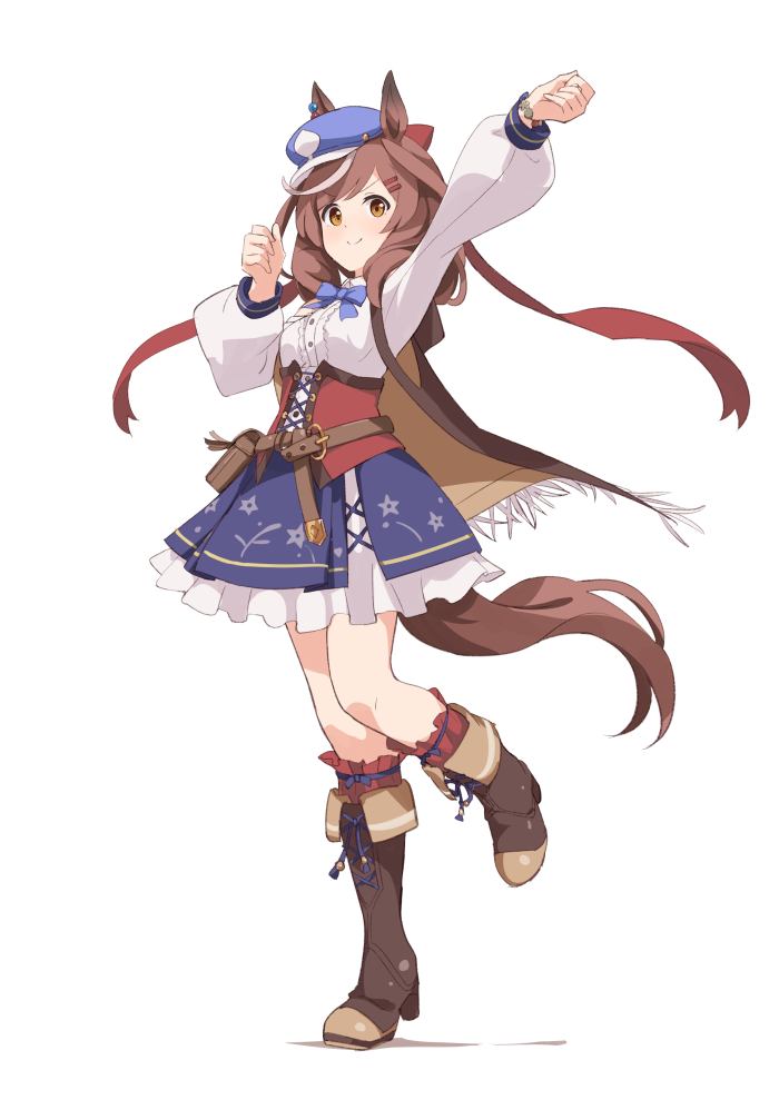 >:) 1girl animal_ears arm_up blue_bow blue_hat blue_skirt blush boots bow breasts brown_boots brown_eyes brown_hair closed_mouth collared_shirt dress_shirt ears_through_headwear frilled_skirt frills fringe_trim guraasan hat horse_ears horse_girl horse_tail long_sleeves matikanetannhauser_(clippety-tippety-clop)_(umamusume) matikanetannhauser_(umamusume) medium_breasts multicolored_hair newsboy_cap puffy_long_sleeves puffy_sleeves shirt skirt smile solo standing standing_on_one_leg streaked_hair tail umamusume v-shaped_eyebrows white_hair white_shirt