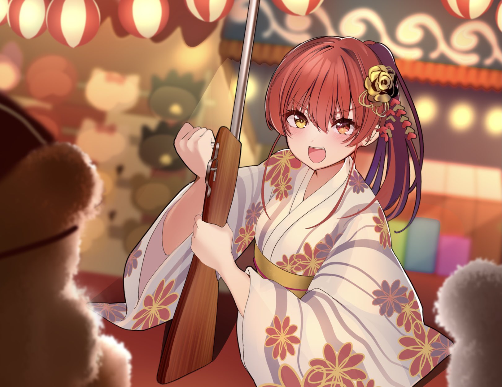 1girl alternate_costume alternate_hairstyle commentary_request cork_gun evening floral_print flower hair_flower hair_ornament heterochromia highres hololive houshou_marine kanzashi lantern medium_hair open_mouth outdoors paper_lantern ponytail red_eyes red_hair sidelocks smile solo standing stuffed_animal stuffed_toy summer_festival teddy_bear upper_body virtual_youtuber yellow_eyes yoshioka_pochi