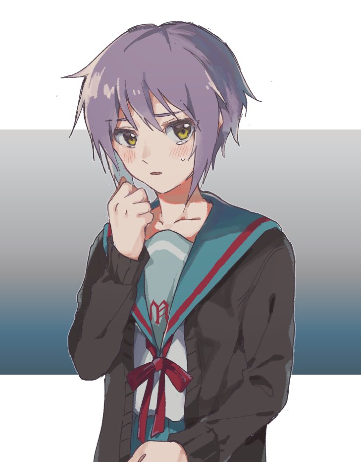 1girl blue_sailor_collar blue_skirt blush brown_cardigan brown_eyes cardigan commentary_request enso_doraiba kita_high_school_uniform long_sleeves looking_at_viewer nagato_yuki open_cardigan open_clothes purple_hair red_ribbon ribbon sailor_collar school_uniform serafuku short_hair skirt solo suzumiya_haruhi_no_shoushitsu suzumiya_haruhi_no_yuuutsu upper_body