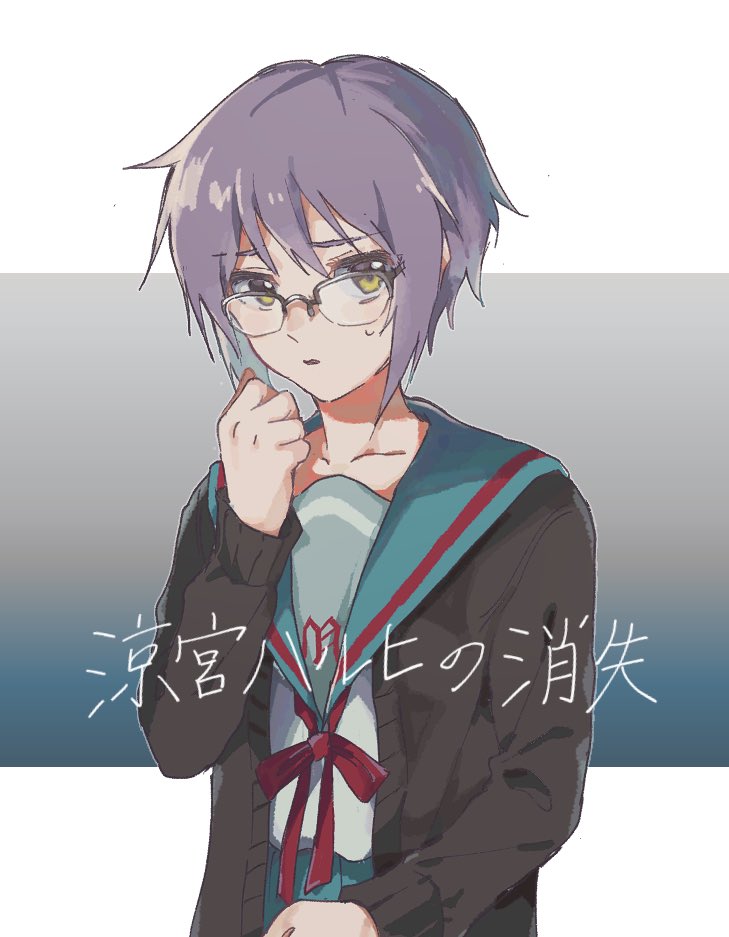 1girl blue_sailor_collar blue_skirt brown_cardigan brown_eyes cardigan commentary_request copyright_name enso_doraiba glasses kita_high_school_uniform long_sleeves looking_at_viewer nagato_yuki open_cardigan open_clothes purple_hair red_ribbon ribbon sailor_collar school_uniform serafuku short_hair skirt solo suzumiya_haruhi_no_shoushitsu suzumiya_haruhi_no_yuuutsu translation_request upper_body