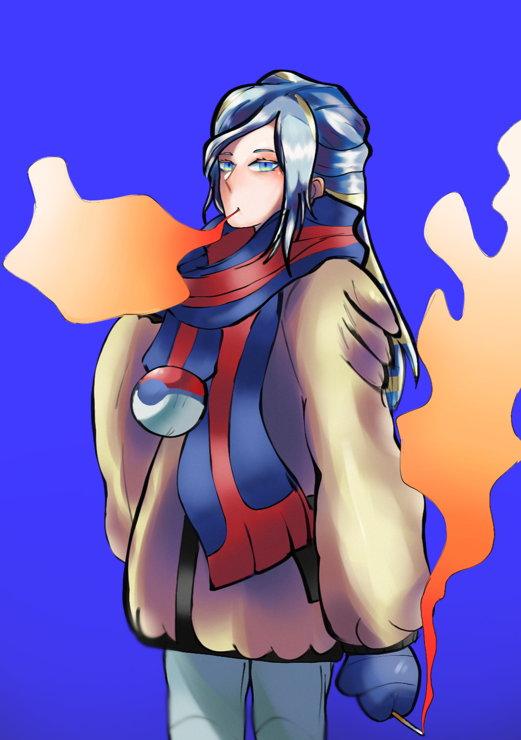 1boy bad_id bad_pixiv_id blue_eyes grusha_(pokemon) highres long_hair looking_at_viewer nintendo pokemon pokemon_(creature) pokemon_sv scarf self-upload simple_background smoking sonasan