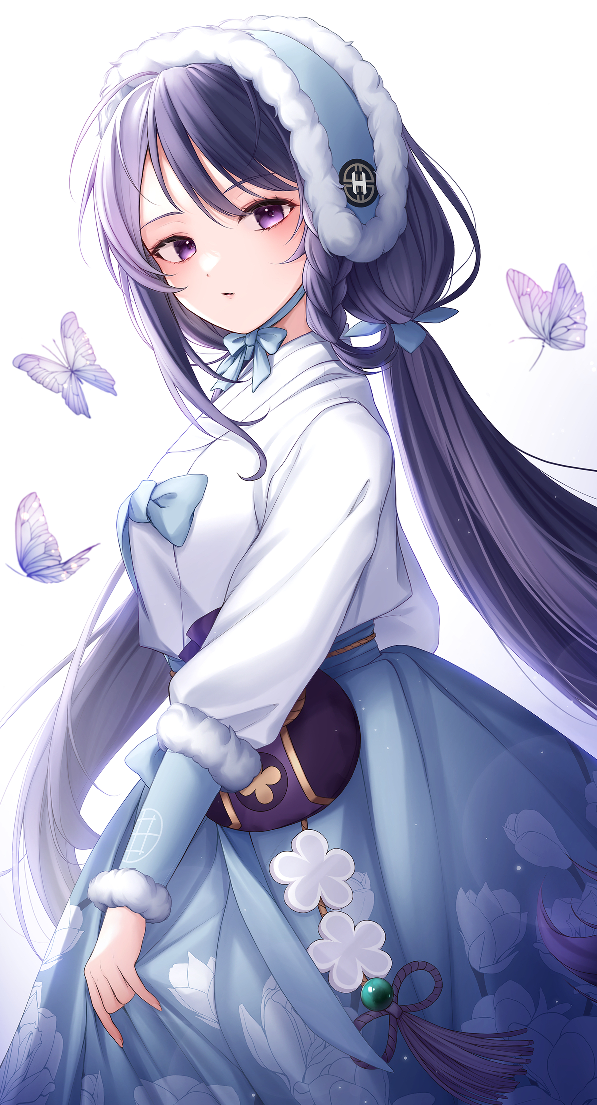 1girl absurdres bag black_hair black_survival blue_bow blue_butterfly blue_dress blue_ribbon blush bonnet bow braid bug butterfly commentary_request cropped_jacket dress expressionless eyelashes floral_print fur-trimmed_headwear fur-trimmed_sleeves fur_trim hair_between_eyes hair_ornament hanbok highres hyejin_(black_survival) insect jacket korean_clothes long_hair long_sleeves looking_at_another looking_at_viewer low_twintails official_alternate_costume open_clothes open_jacket parted_lips pomeo_dayo pouch print_dress purple_eyes ribbon side_braid sidelocks single_braid solo standing swept_bangs tassel twintails very_long_hair white_background white_jacket