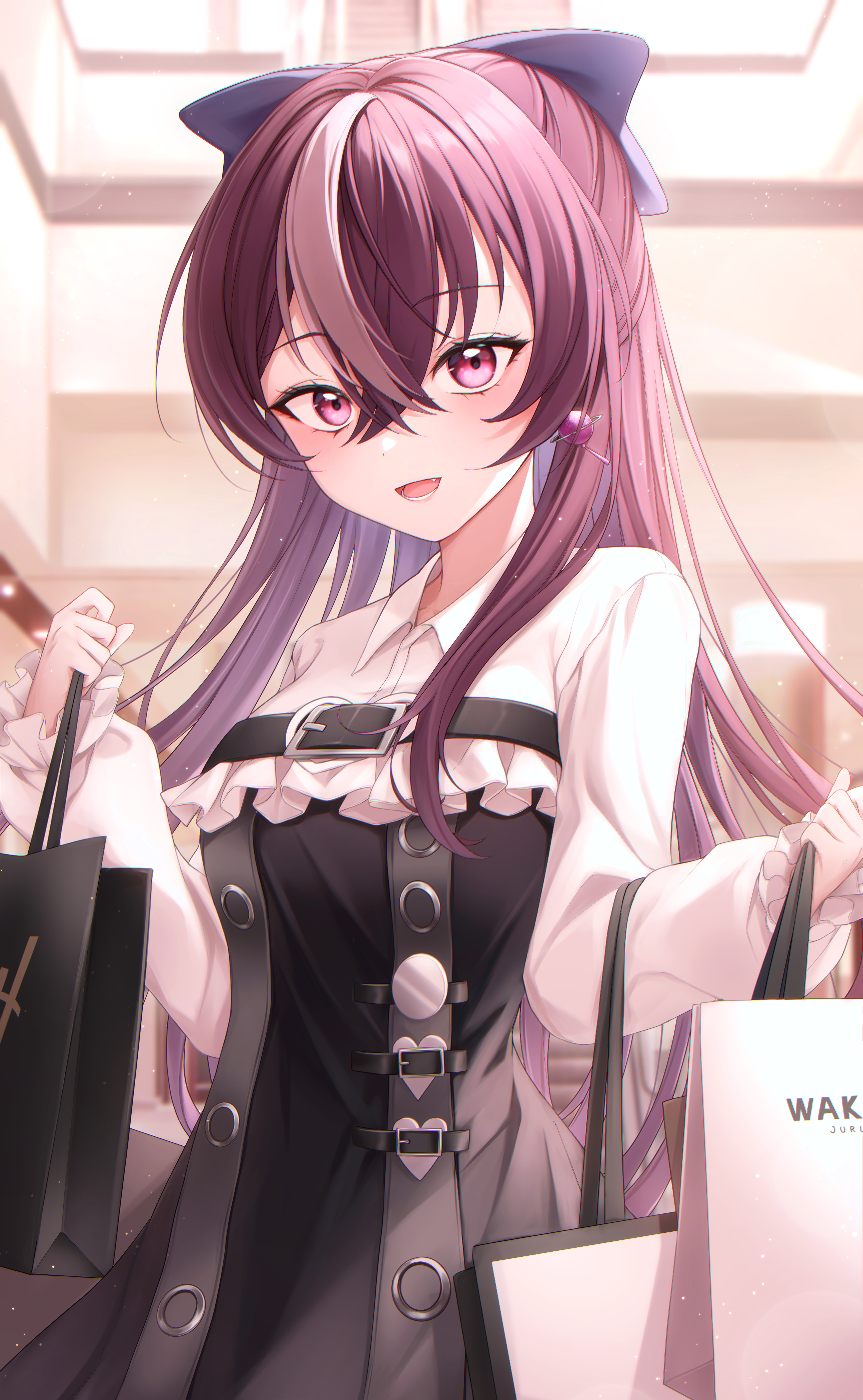 1girl :d absurdres bag belt belt_buckle black_belt black_dress blue_bow blurry blurry_background blush bow brown_hair buckle collared_shirt commentary cropped_shirt crossed_bangs dress earrings elbow_carry eyelashes fang frilled_shirt frilled_sleeves frills hair_between_eyes hair_bow hair_ornament hands_up heart highres holding holding_bag indoors jewelry jururu light_particles long_hair long_sleeves looking_at_viewer multicolored_hair open_mouth planet_earrings pomeo_dayo puffy_long_sleeves puffy_sleeves purple_eyes round_teeth shirt shopping shopping_bag sidelocks single_earring smile solo streaked_hair teeth tongue two-tone_hair very_long_hair virtual_youtuber waktaverse white_hair white_shirt wing_collar