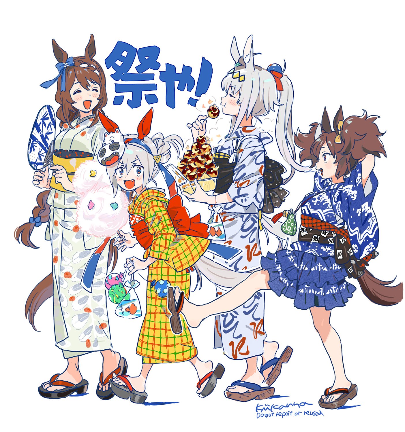4girls ahoge alternate_costume alternate_hairstyle animal_ears blue_kimono blush braid braided_ponytail brown_hair closed_eyes cotton_candy fang fish food goldfish grey_hair hairband hand_fan highres holding holding_cotton_candy holding_fan holding_food horse_ears horse_girl horse_tail inari_one_(umamusume) japanese_clothes kiikanna kimono kimono_skirt looking_at_viewer mask mask_on_head midori_makibaoo midori_no_makibaoo multiple_girls obi oguri_cap_(umamusume) open_mouth paper_fan ponytail sandals sash signature simple_background smile steam super_creek_(umamusume) tail takoyaki tamamo_cross_(umamusume) toothpick translation_request twintails uchiwa umamusume walking water_balloon white_background white_kimono yellow_kimono yukata zouri