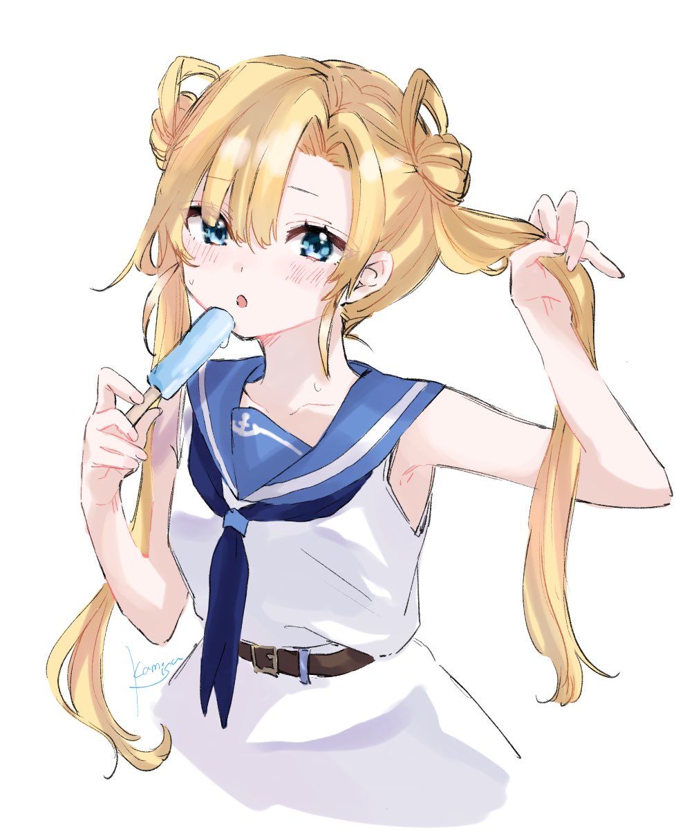 1girl :o abukuma_(kancolle) alternate_costume bad_id bad_twitter_id blonde_hair blue_neckerchief blue_sailor_collar blush cropped_torso double_bun dress food hair_between_eyes hair_bun highres holding holding_own_hair kamisuiori kantai_collection long_hair looking_at_viewer neckerchief parted_lips popsicle sailor_collar sailor_dress signature simple_background sleeveless sleeveless_dress solo sweat twintails white_background white_dress
