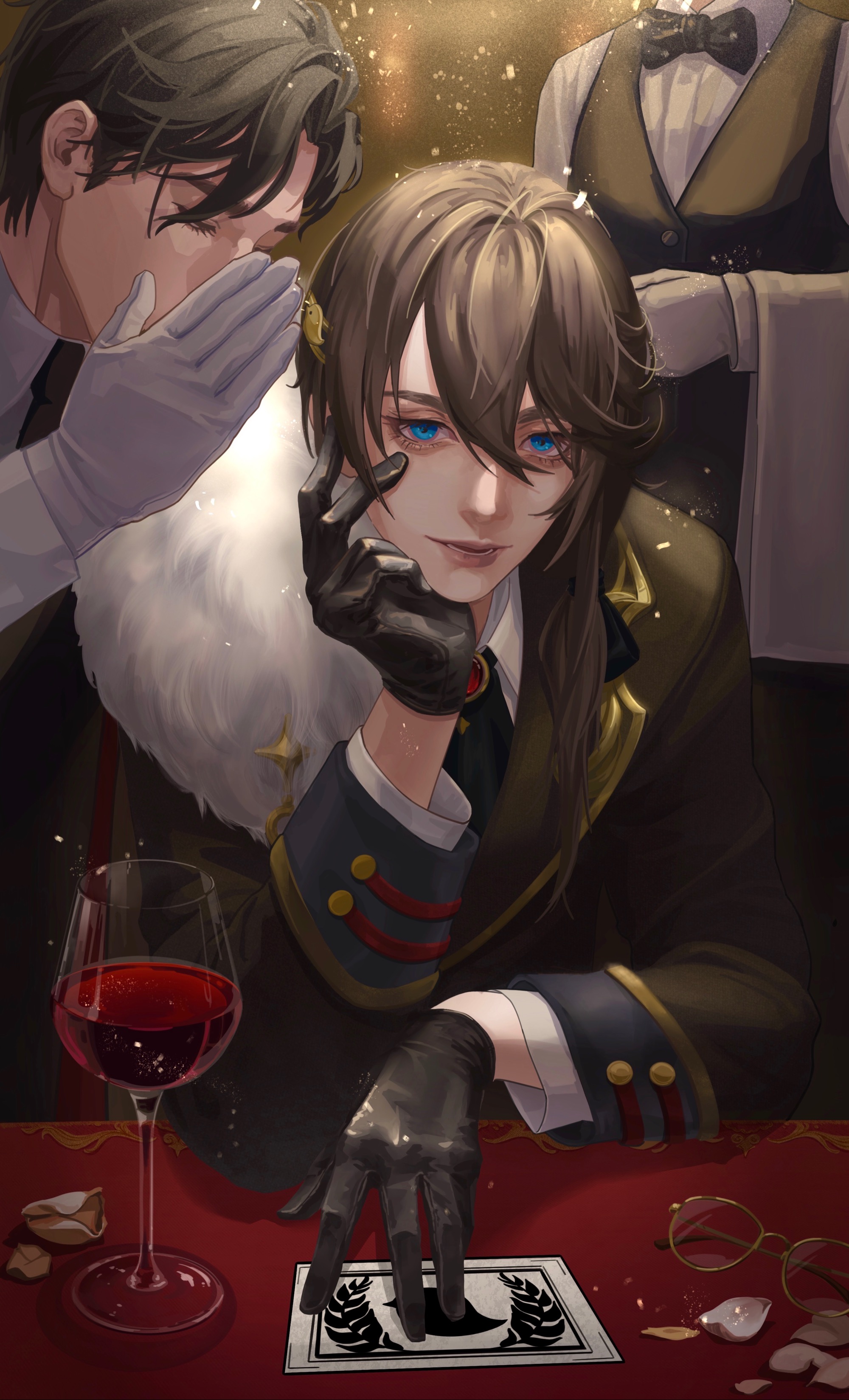 absurdres alcohol bishounen black_hair blue_eyes butler unworn_eyewear formal_clothes gloves highres jewelry kyouka_(overidea) long_sleeves looking_at_viewer male_focus necktie overidea petals shirt short_hair virtual828 white_gloves