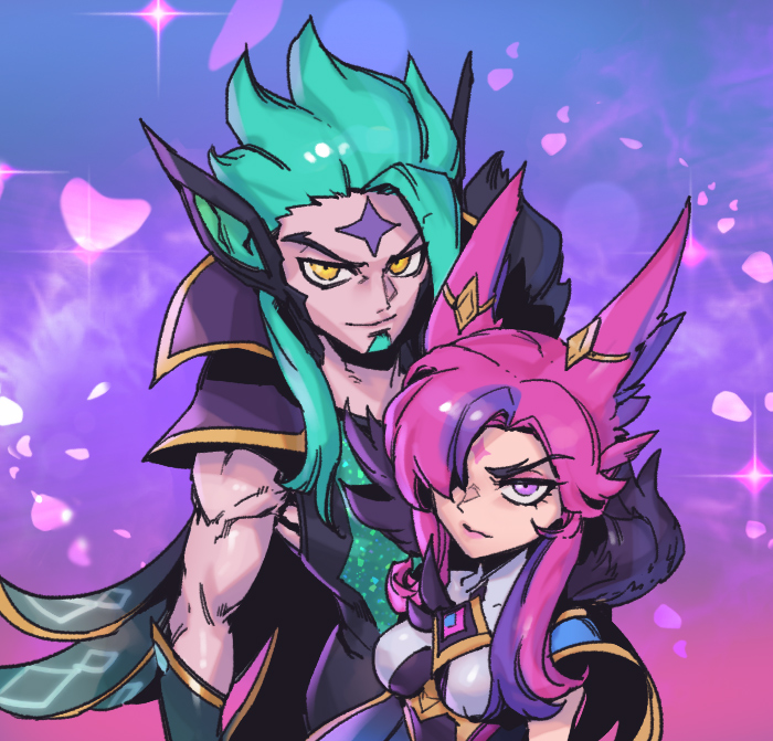 1boy 1girl animal_ears annoyed black_cape breasts cape closed_mouth fur_trim gem green_hair hair_over_one_eye large_breasts league_of_legends long_hair multicolored_background petals phantom_cross pink_eyes pointy_ears rakan_(league_of_legends) smile star_(symbol) star_guardian_(league_of_legends) star_guardian_rakan star_guardian_xayah star_tattoo tattoo xayah