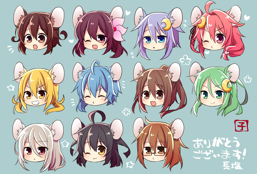6+girls ahoge animal_ears asymmetrical_hair blonde_hair blue_eyes blue_hair brown_eyes brown_hair rabbit_hair_ornament crescent crescent_hair_ornament closed_eyes fumizuki_(kancolle) glasses green_eyes green_hair grey_hair hair_between_eyes hair_ornament kantai_collection kikuzuki_(kancolle) kisaragi_(kancolle) long_hair low-tied_long_hair low_twintails mikazuki_(kancolle) minazuki_(kancolle) mochizuki_(kancolle) mouse_ears multiple_girls mutsuki_(kancolle) nagasioo nagatsuki_(kancolle) one_eye_closed ponytail purple_eyes purple_hair red_eyes red_hair satsuki_(kancolle) short_hair short_hair_with_long_locks sidelocks smile twintails uzuki_(kancolle) yayoi_(kancolle)