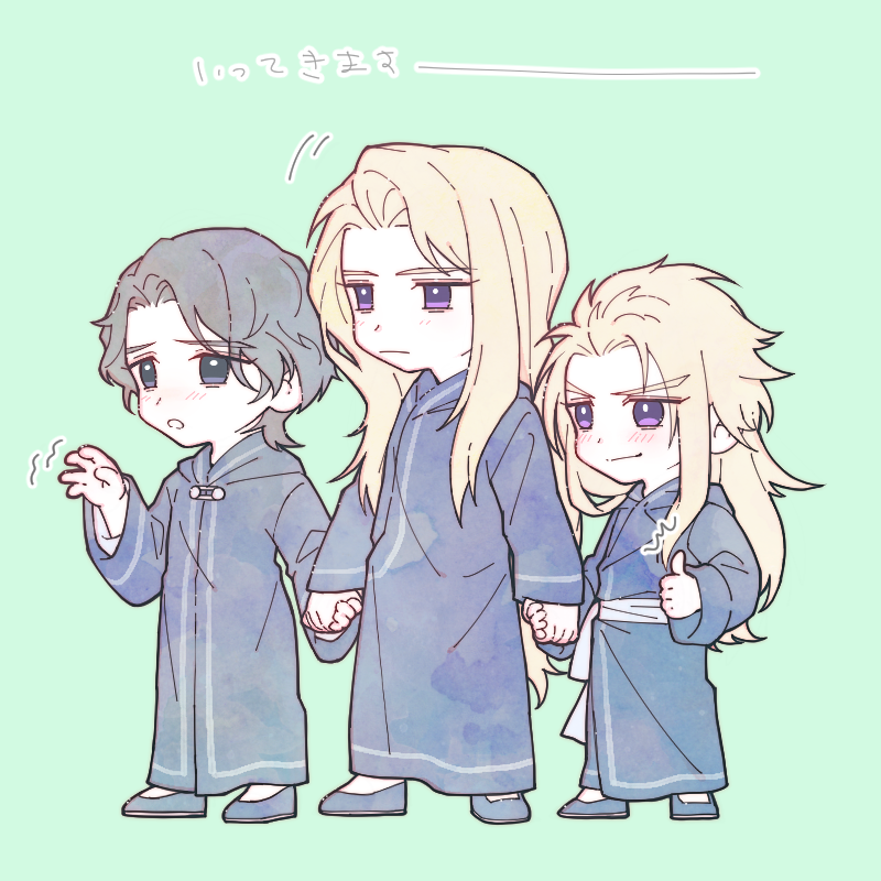 3boys arms_at_sides black_hair blonde_hair blue_footwear blue_robe chibi enki_(juuni_kokuki) flats full_body ggggg grey_eyes grey_hair hand_up juuni_kokuki keiki_(juuni_kokuki) lineup long_hair long_sleeves looking_afar male_focus multiple_boys nodding purple_eyes reaching robe sash simple_background standing taiki_(juuni_kokuki) thumbs_up trembling very_long_hair