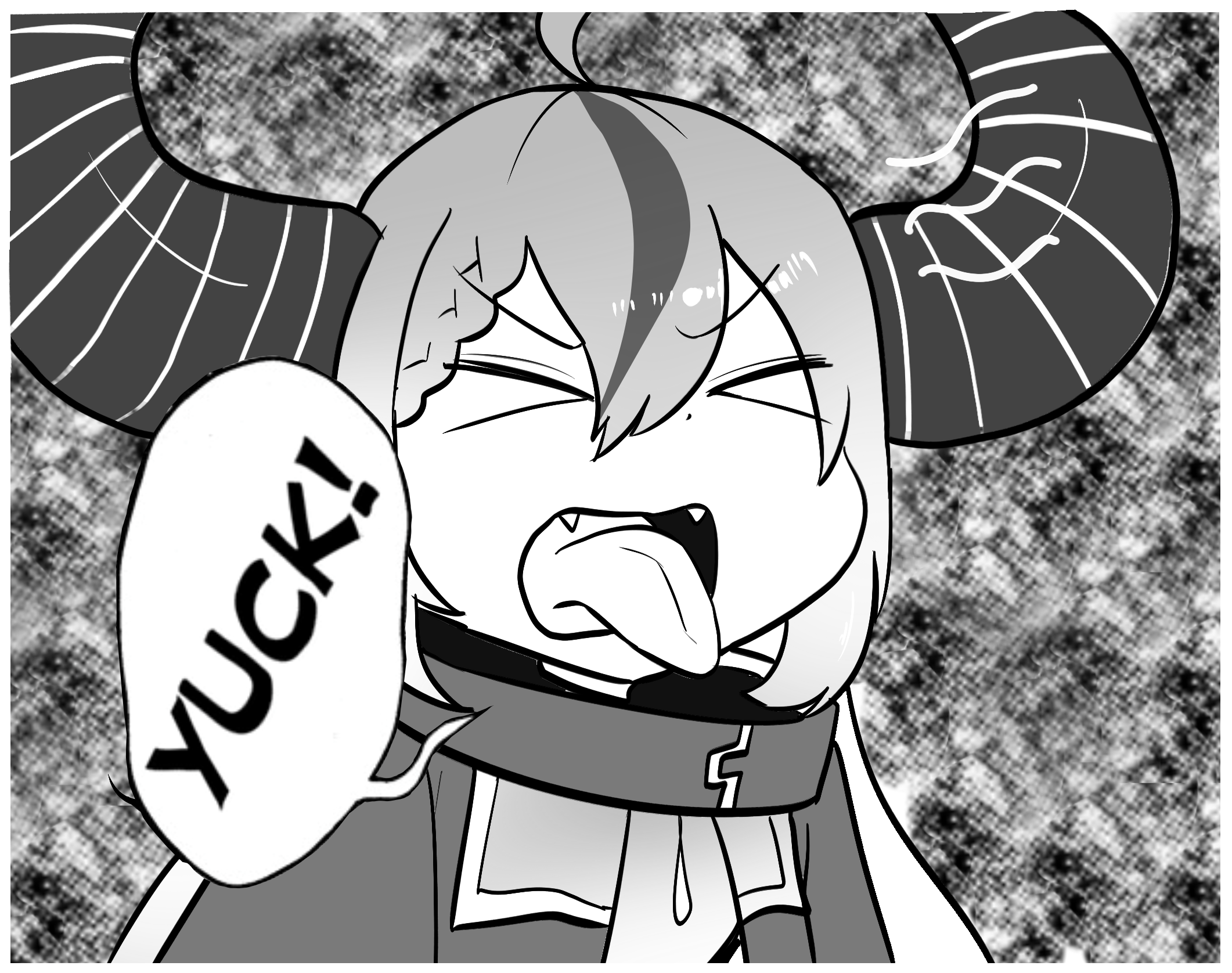 >_< 1girl collar derivative_work drawfag fangs greyscale highres hololive horns la+_darknesss comic_panel_redraw monochrome multicolored_hair portrait solo speech_bubble streaked_hair tongue tongue_out touhou v-shaped_eyebrows virtual_youtuber