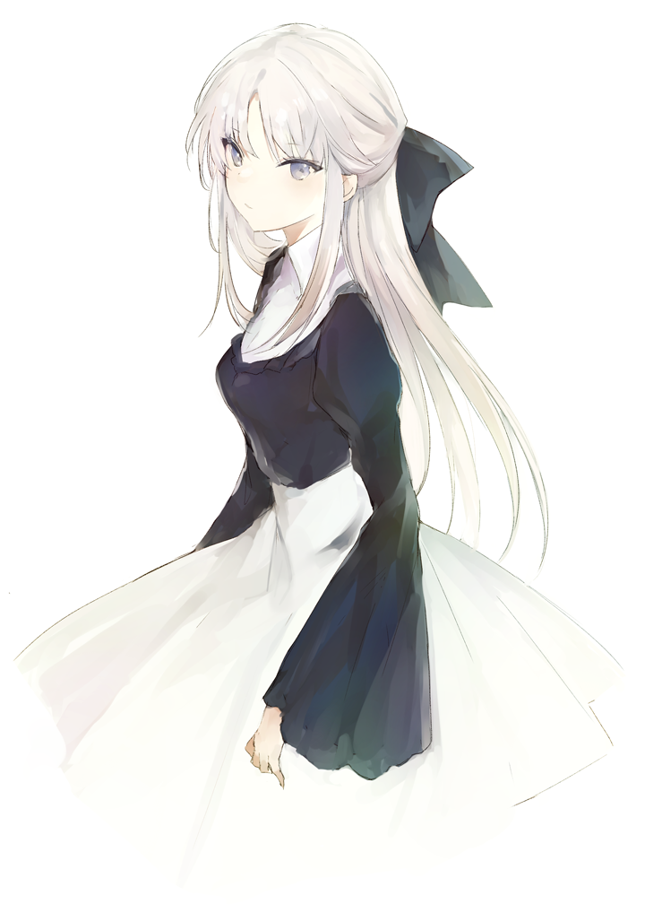 1girl black_bow black_shirt bow breasts closed_mouth collared_shirt grey_eyes hair_bow juliet_sleeves long_hair long_sleeves looking_at_viewer lpip medium_breasts original puffy_sleeves shirt simple_background skirt sleeves_past_wrists solo very_long_hair white_background white_hair white_shirt white_skirt wide_sleeves