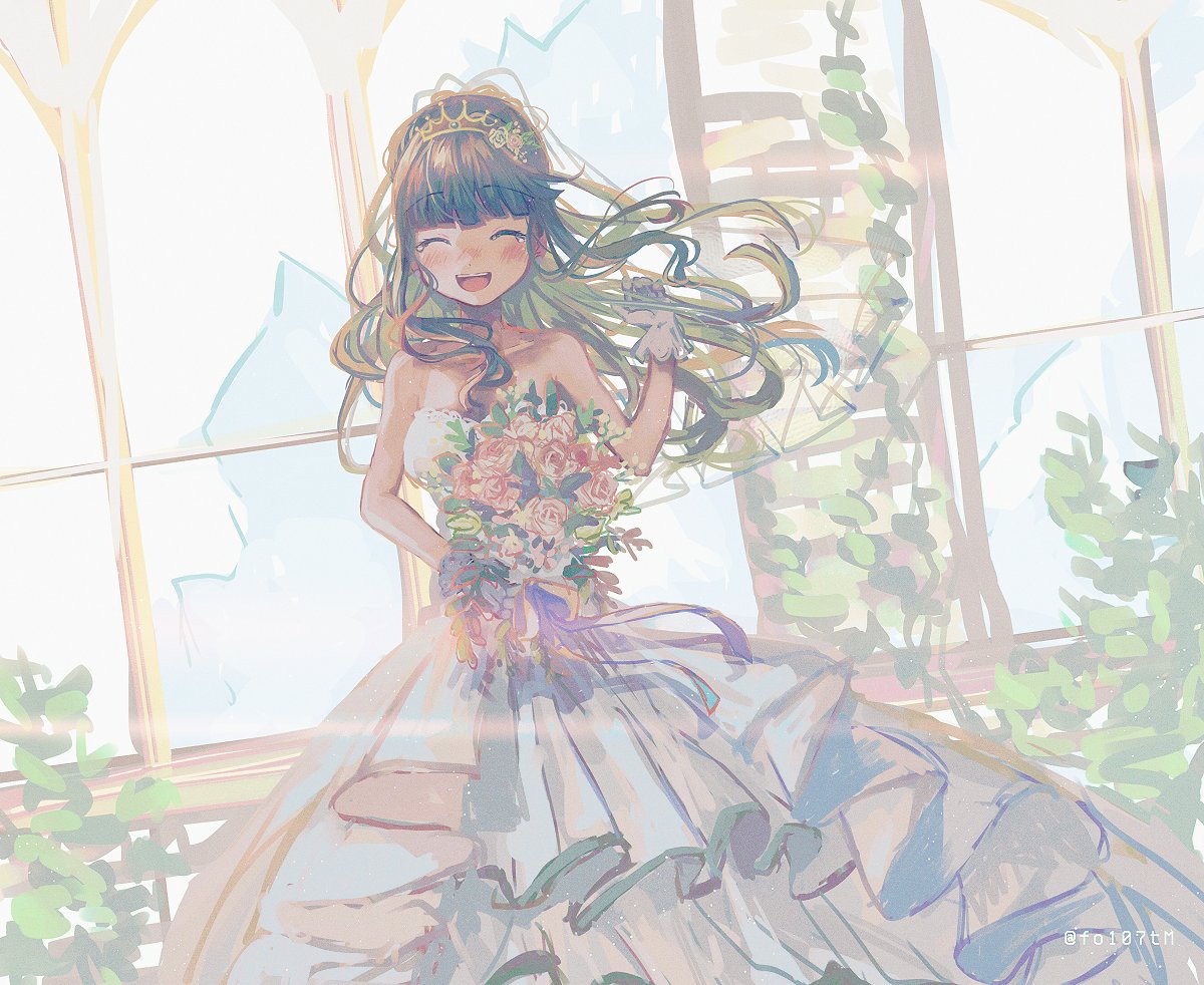 1girl alternate_costume alternate_hairstyle blunt_bangs blush bouquet broken_glass broken_window closed_eyes cowboy_shot crown dot_nose dress dutch_angle flower futaba_sana glass gloves green_hair hair_flower hair_ornament hand_up happy happy_tears holding holding_bouquet long_hair magia_record:_mahou_shoujo_madoka_magica_gaiden mahou_shoujo_madoka_magica mini_crown open_mouth pink_flower pink_rose ponytail rose sidelocks solo strapless strapless_dress tears teeth totte twitter_username upper_teeth_only veil wavy_hair wedding_dress white_dress white_flower white_gloves white_rose wind