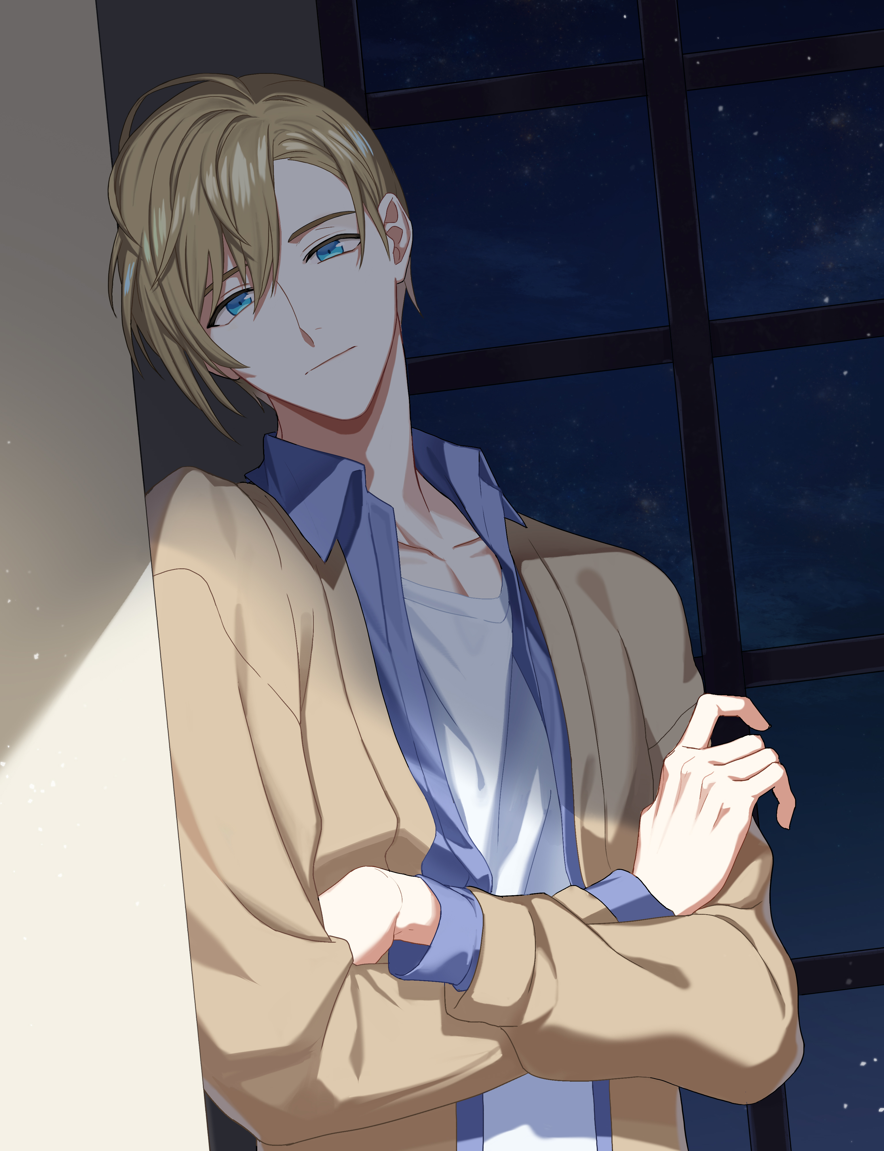1boy absurdres afterl!fe blonde_hair blue_eyes closed_mouth collared_shirt crossed_arms highres leaning_to_the_side long_sleeves looking_at_viewer male_focus multicolored_clothes night shirt short_hair sky smile solo star_(sky) theo_(afterl!fe) ugyang