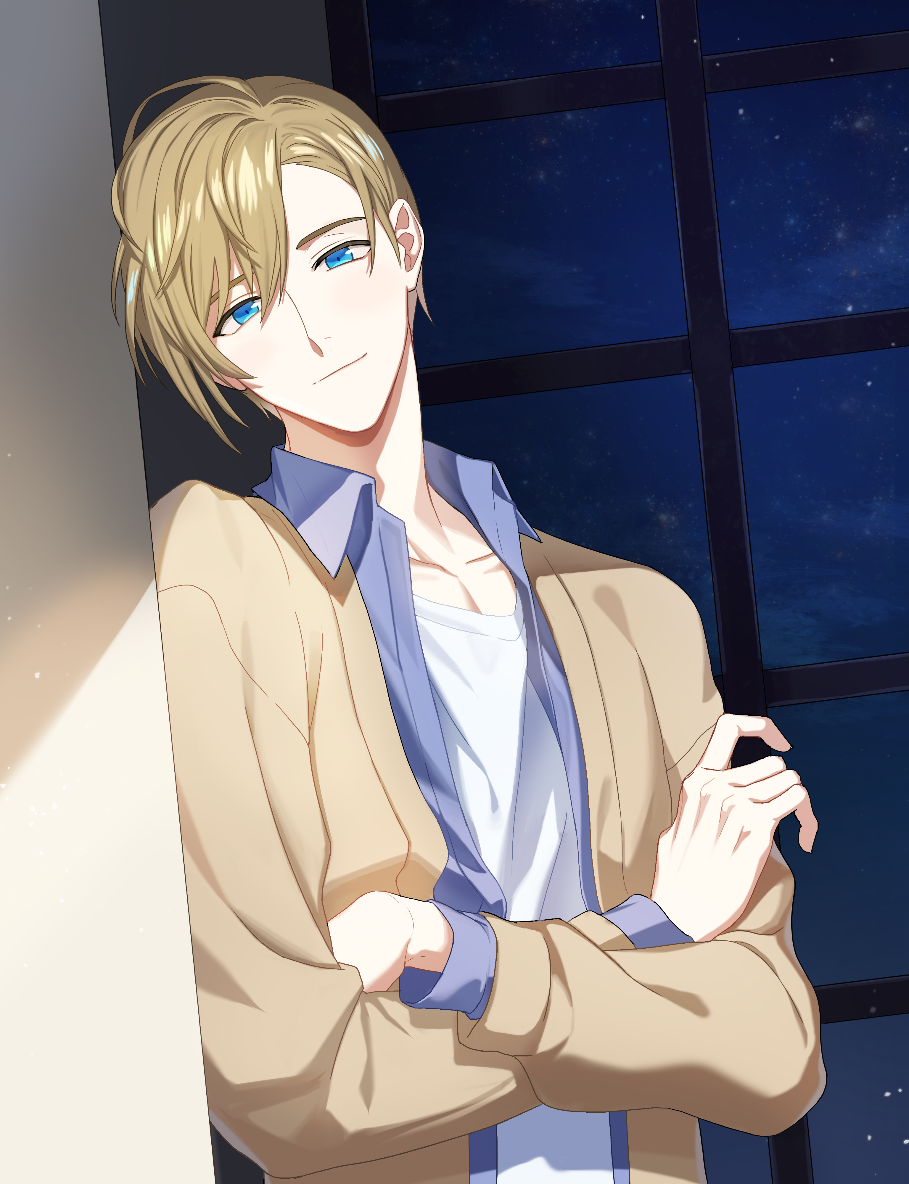 1boy absurdres afterl!fe blonde_hair blue_eyes closed_mouth collared_shirt crossed_arms highres leaning_to_the_side long_sleeves looking_at_viewer male_focus multicolored_clothes night shirt short_hair sky smile solo star_(sky) theo_(afterl!fe) ugyang