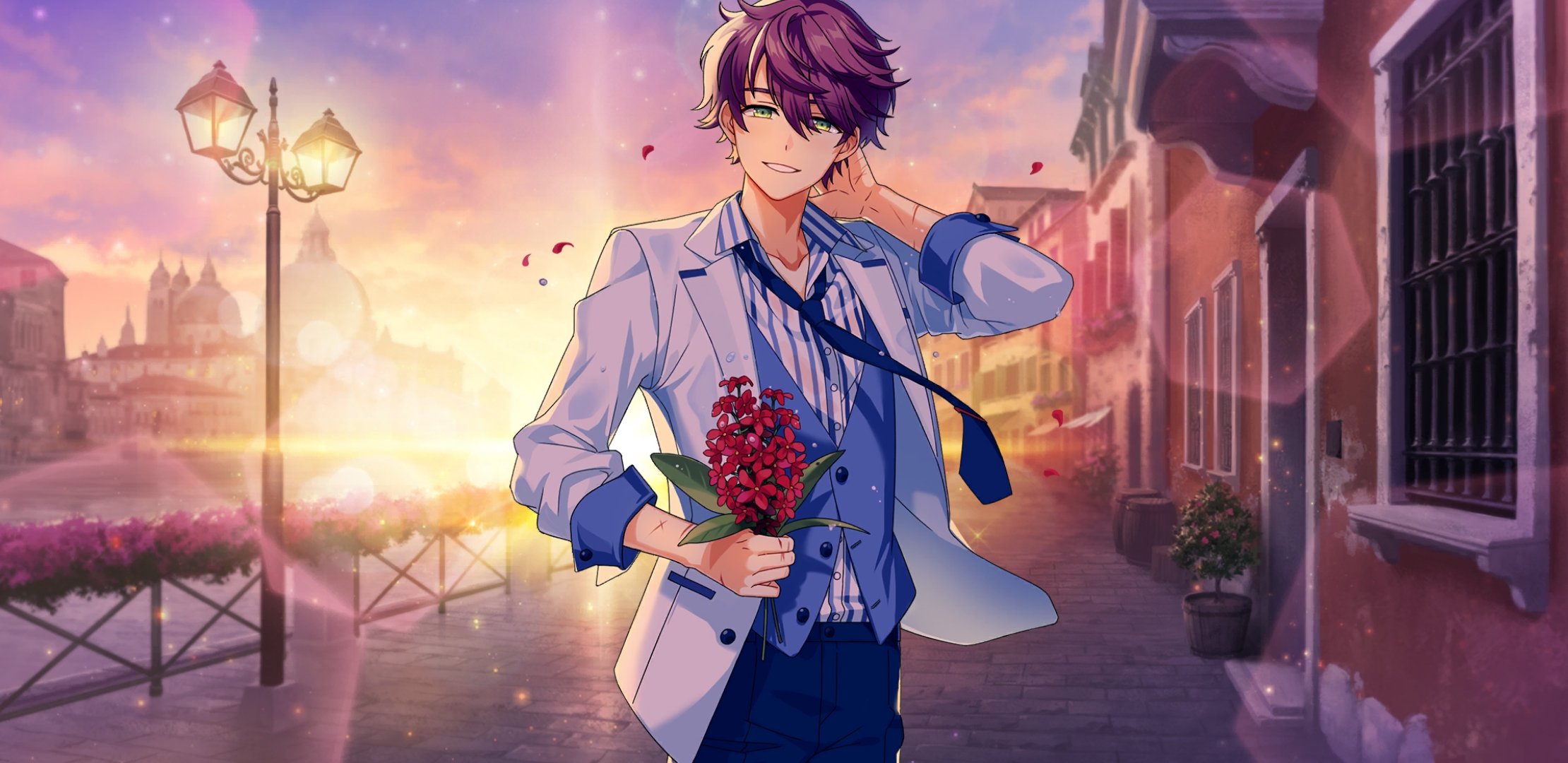 1boy afterl!fe blush flower green_eyes highres looking_at_viewer male_focus noah_(afterl!fe) official_art purple_hair red_flower scar second-party_source short_hair smile solo teeth