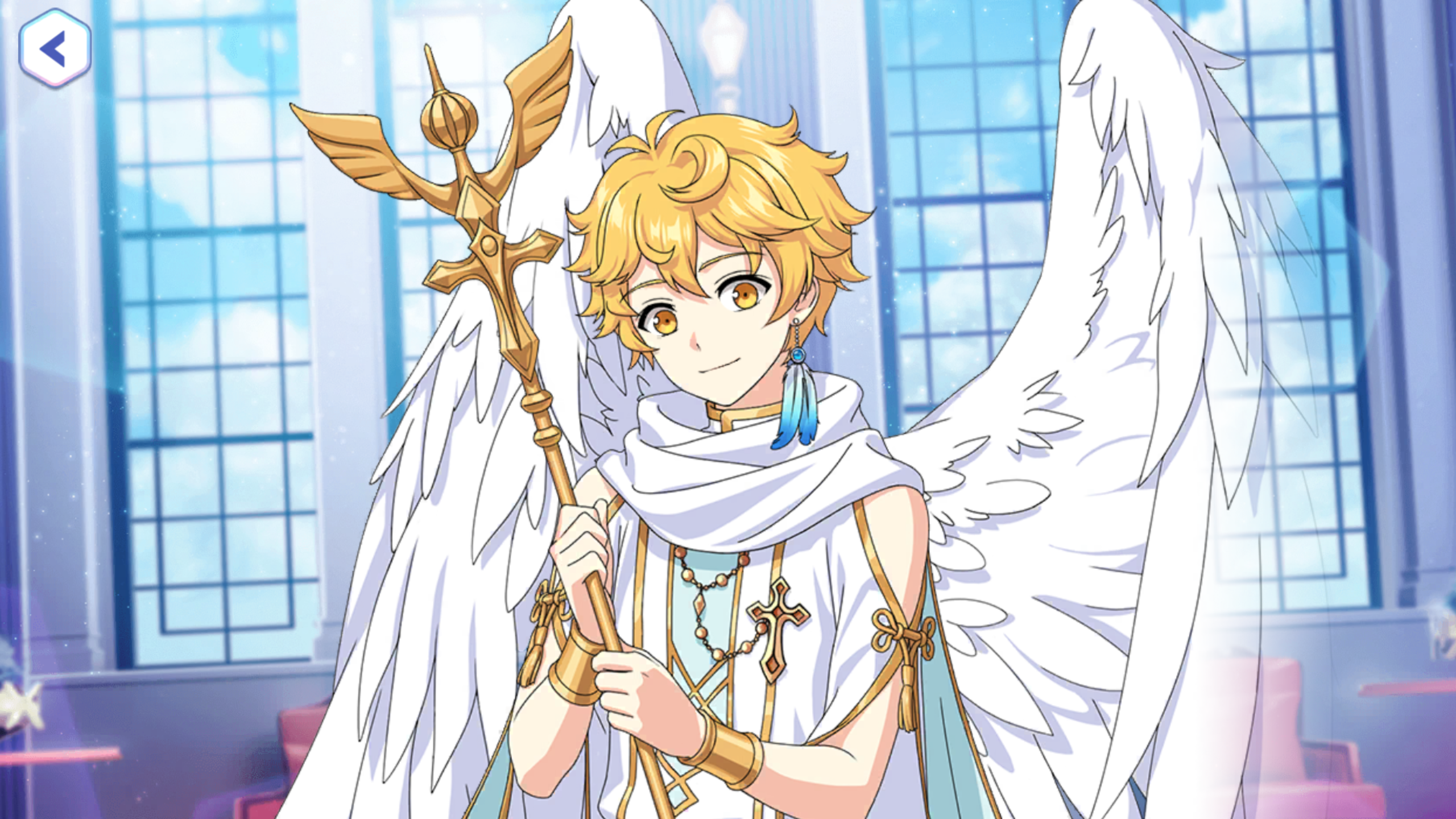 1boy afterl!fe angel angel_wings blonde_hair earrings ell_(afterl!fe) feather_earrings feathers highres jewelry looking_at_viewer male_focus official_art second-party_source shirt short_hair sleeveless sleeveless_shirt smile solo window wings yellow_eyes
