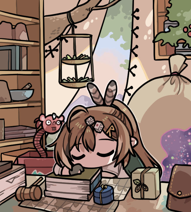 1girl ahoge berry book bookshelf bowl branch brown_hair clipe closed_eyes dice_hair_ornament feather_hair_ornament feathers gavel gift gloves hair_ornament hairclip hakos_baelz halloween_baelz hanging_plant hololive hololive_english jack-in-the-box long_hair map mortar_(bowl) multicolored_hair nanashi_mumei nanashi_mumei_(1st_costume) package partially_fingerless_gloves ponytail pouch shelf shirt sleeping space_print starry_sky_print streaked_hair treehouse very_long_hair virtual_youtuber white_shirt