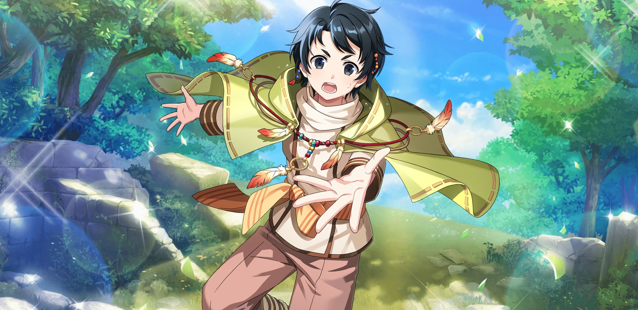 1boy afterl!fe aitachi_(afterl!fe) black_eyes black_hair cape feathers highres hood hood_down hoodie long_sleeves looking_at_viewer male_focus official_art open_mouth outstretched_arm pants second-party_source short_hair solo teeth