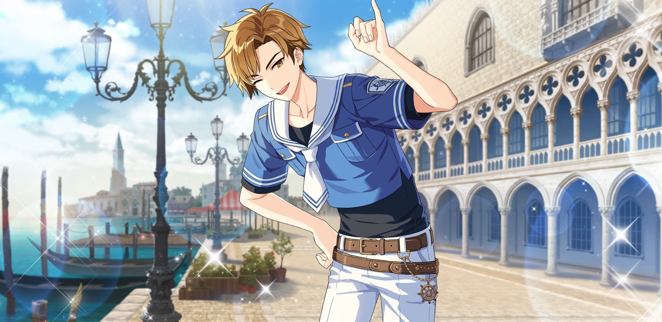1boy afterl!fe belt blue_sky brown_eyes brown_hair cloud cloudy_sky highres licht_(afterl!fe) looking_at_viewer male_focus official_art one_eye_closed open_mouth pants sailor_collar sailor_shirt second-party_source shirt short_hair sky solo