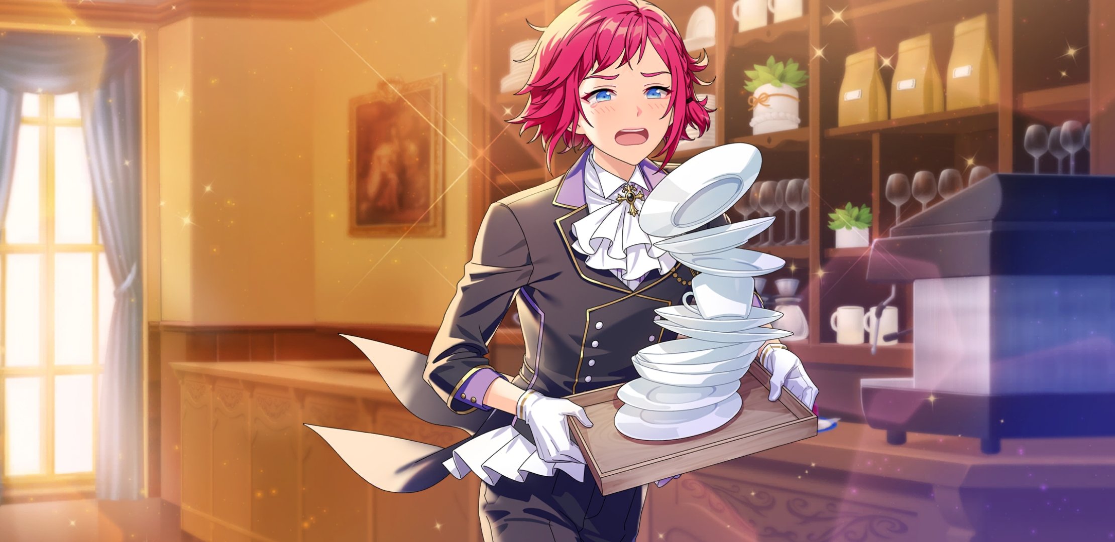 1boy afterl!fe androgynous blue_eyes blush butler coattails crying formal_clothes gloves highres long_sleeves male_focus official_art open_mouth pink_hair plate quincy_(afterl!fe) second-party_source short_hair solo suit tailcoat tearing_up tripping