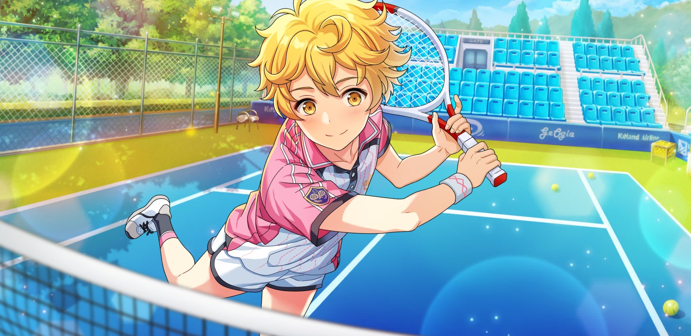 1boy afterl!fe bleachers blonde_hair blush ell_(afterl!fe) highres looking_at_viewer male_focus official_art playing_sports racket second-party_source short_hair short_sleeves shorts smile solo tennis tennis_court tennis_racket yellow_eyes