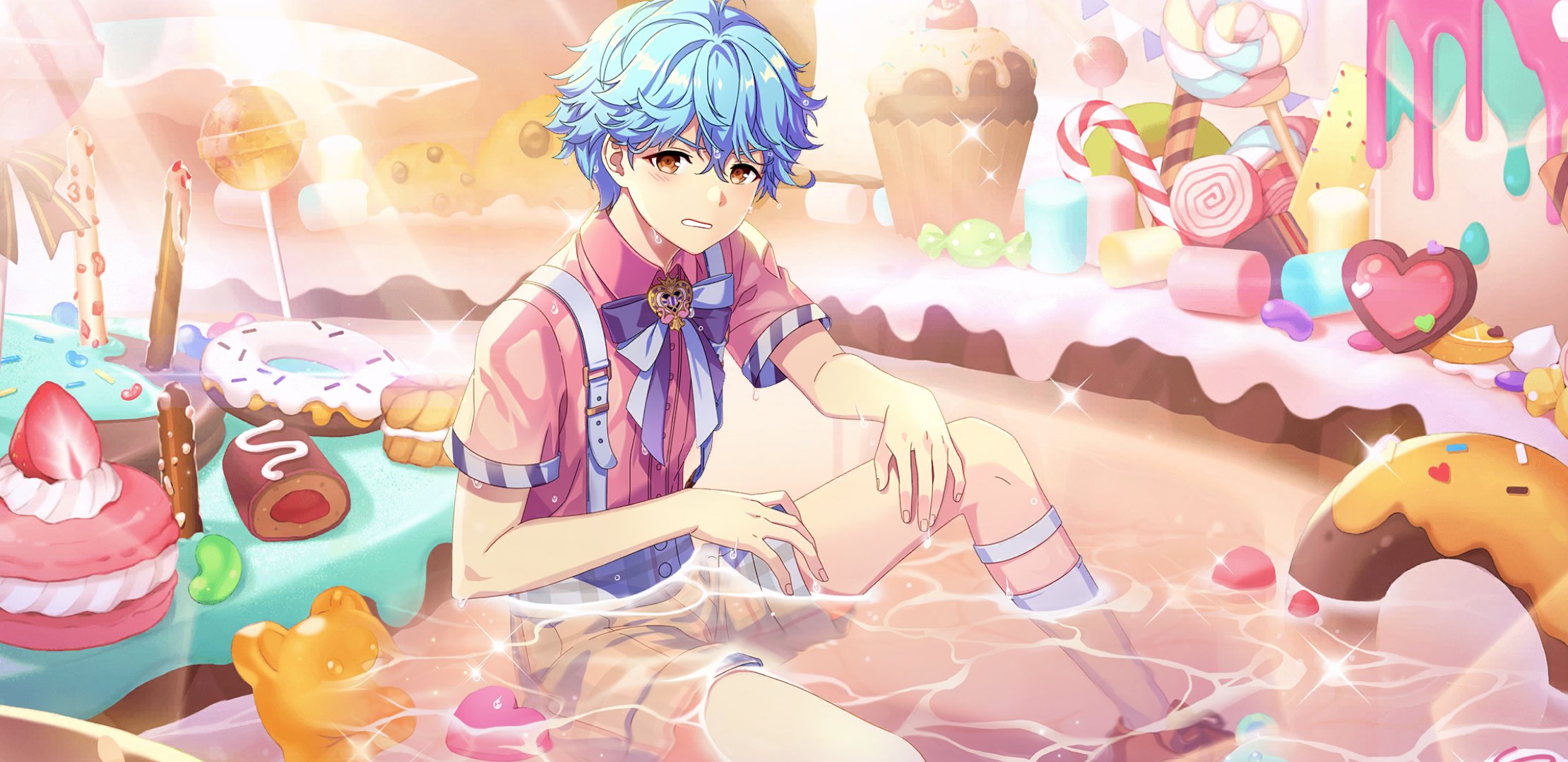 1boy afterl!fe blue_hair brown_eyes cake candy food highres jamie_(afterl!fe) looking_at_viewer male_focus official_art open_mouth pastel_colors scowl second-party_source short_hair short_sleeves shorts socks solo suspenders sweets teeth white_socks