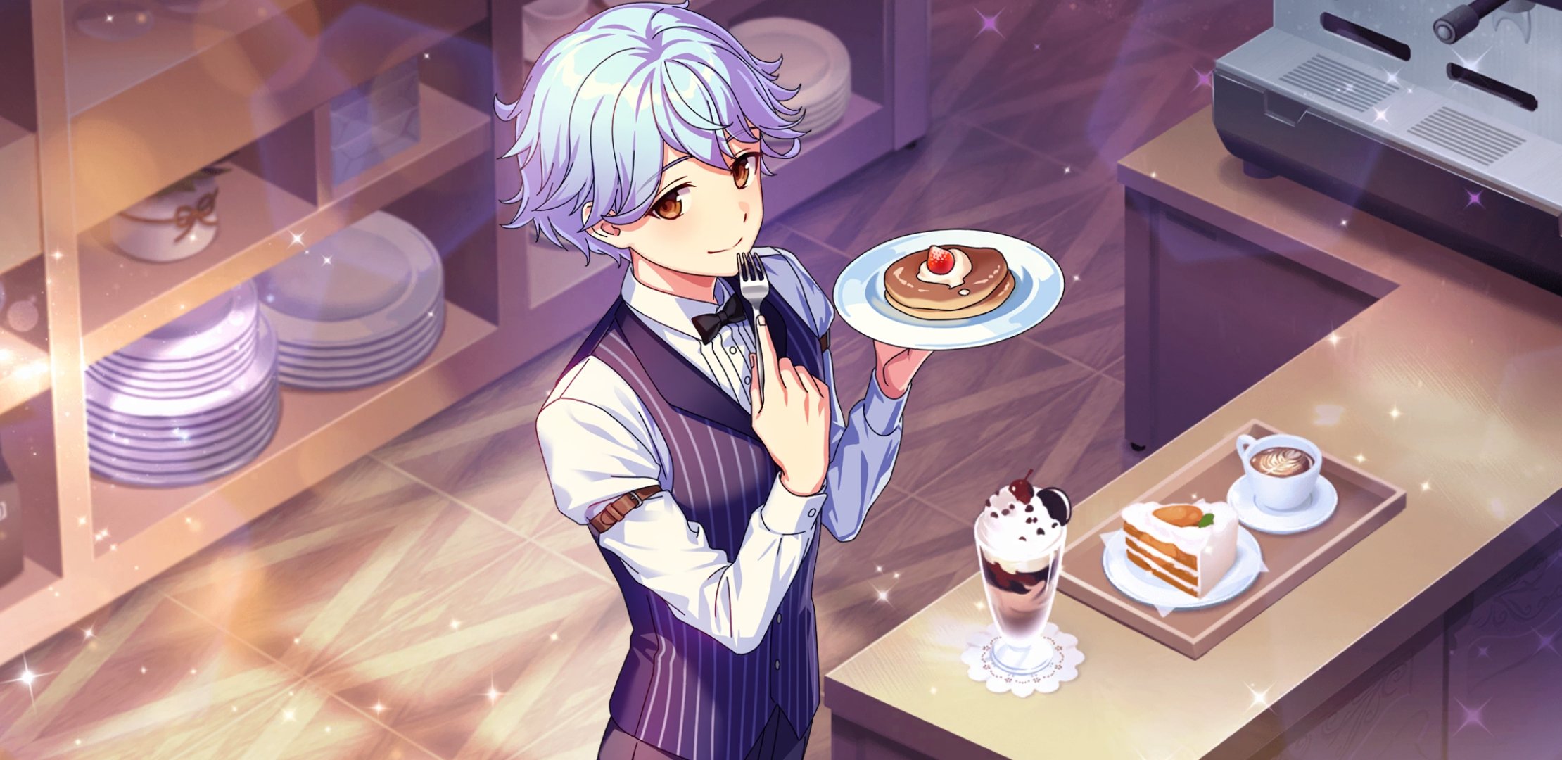 1boy afterl!fe blue_hair brown_eyes food fork highres ice_cream jamie_(afterl!fe) long_sleeves looking_at_viewer male_focus official_art pancake pancake_stack plate second-party_source short_hair smile solo vest